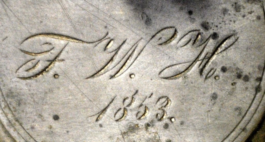 Tysk westenwälder krus, 1853, stentøj, med grå saltglasur. Med manganviolet dekorationer. Med låg og gæk i tin. Indgraveret: F.W.H. 1853. H: 23 cm.