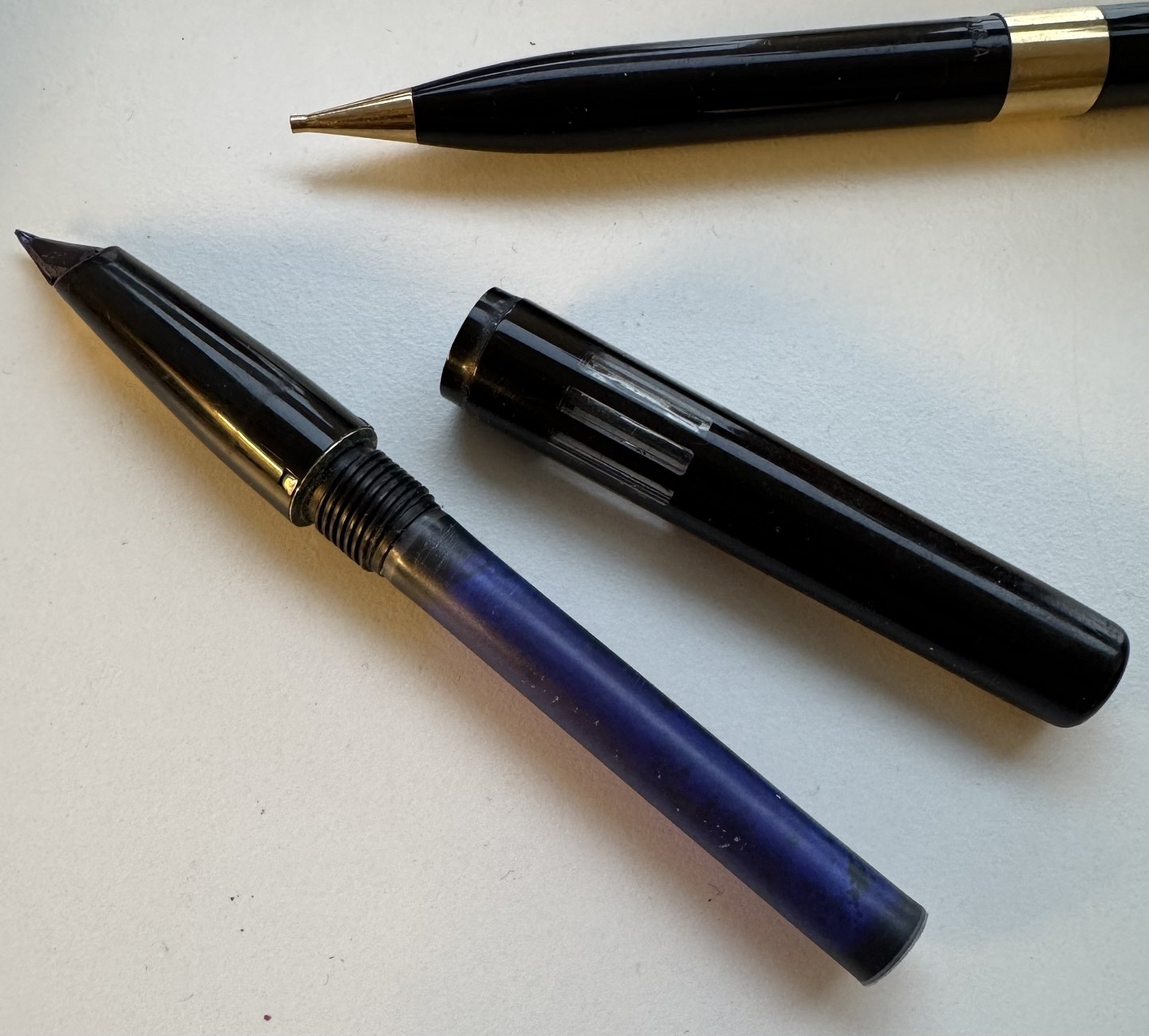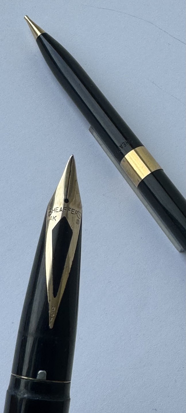 Alle dele originale Sheaffers inklusiv en 14 karat guldspids. Fyldepennen er 12 cm lang og skrueblyanten er 12,8 cm lang.