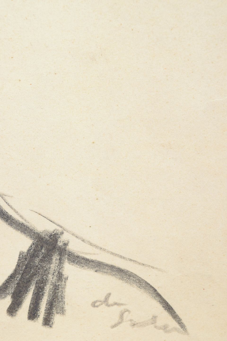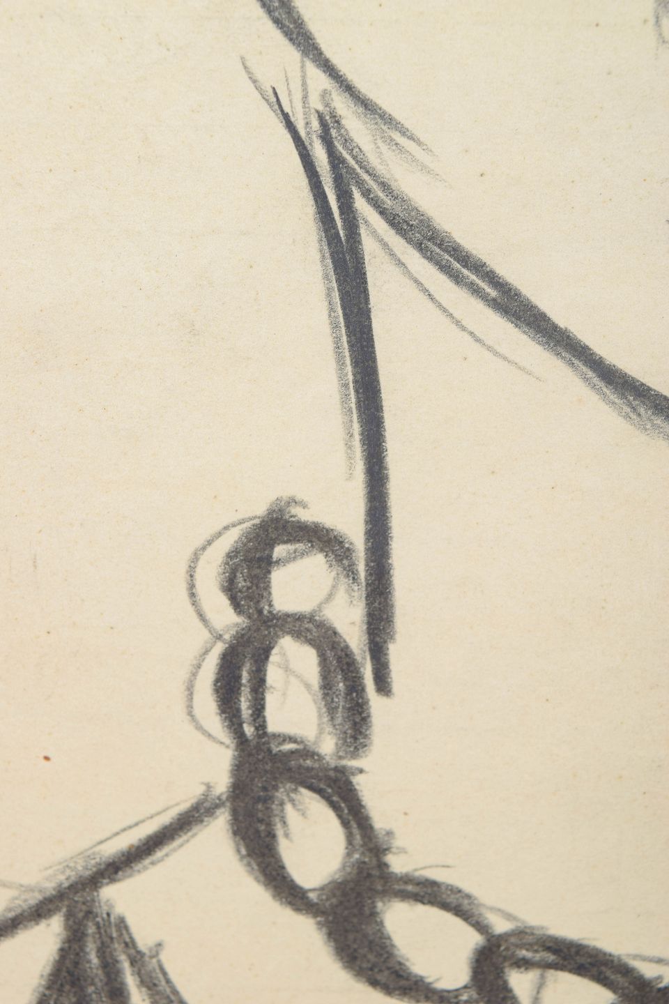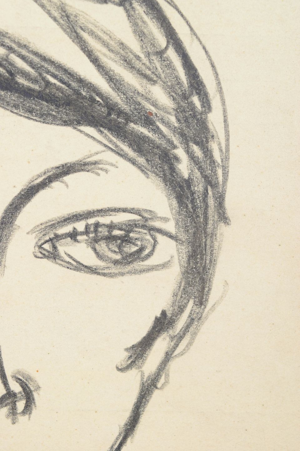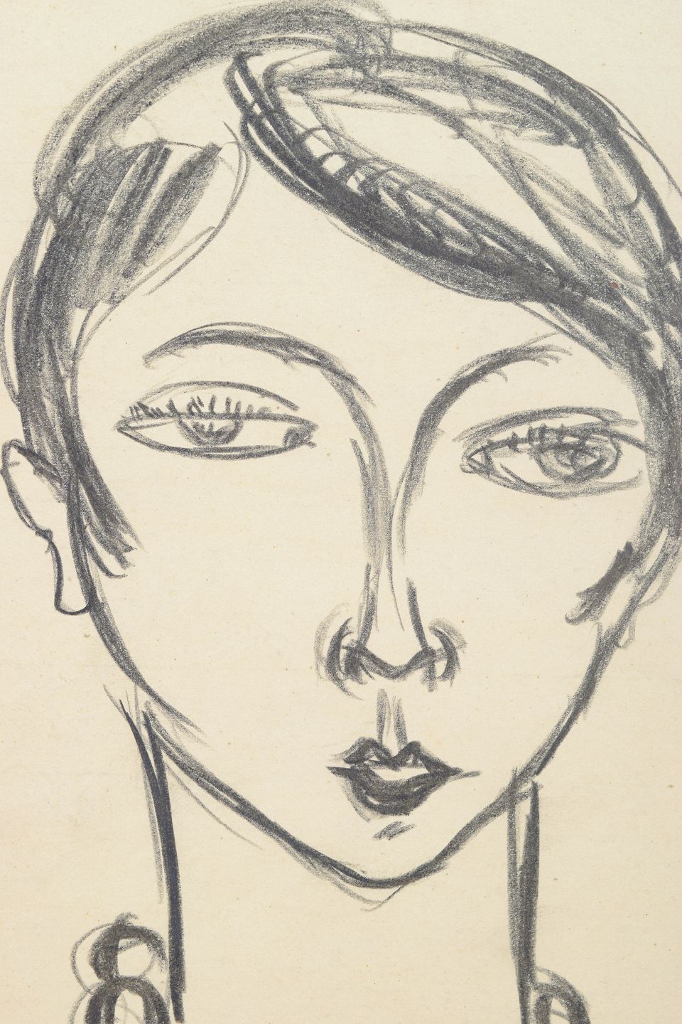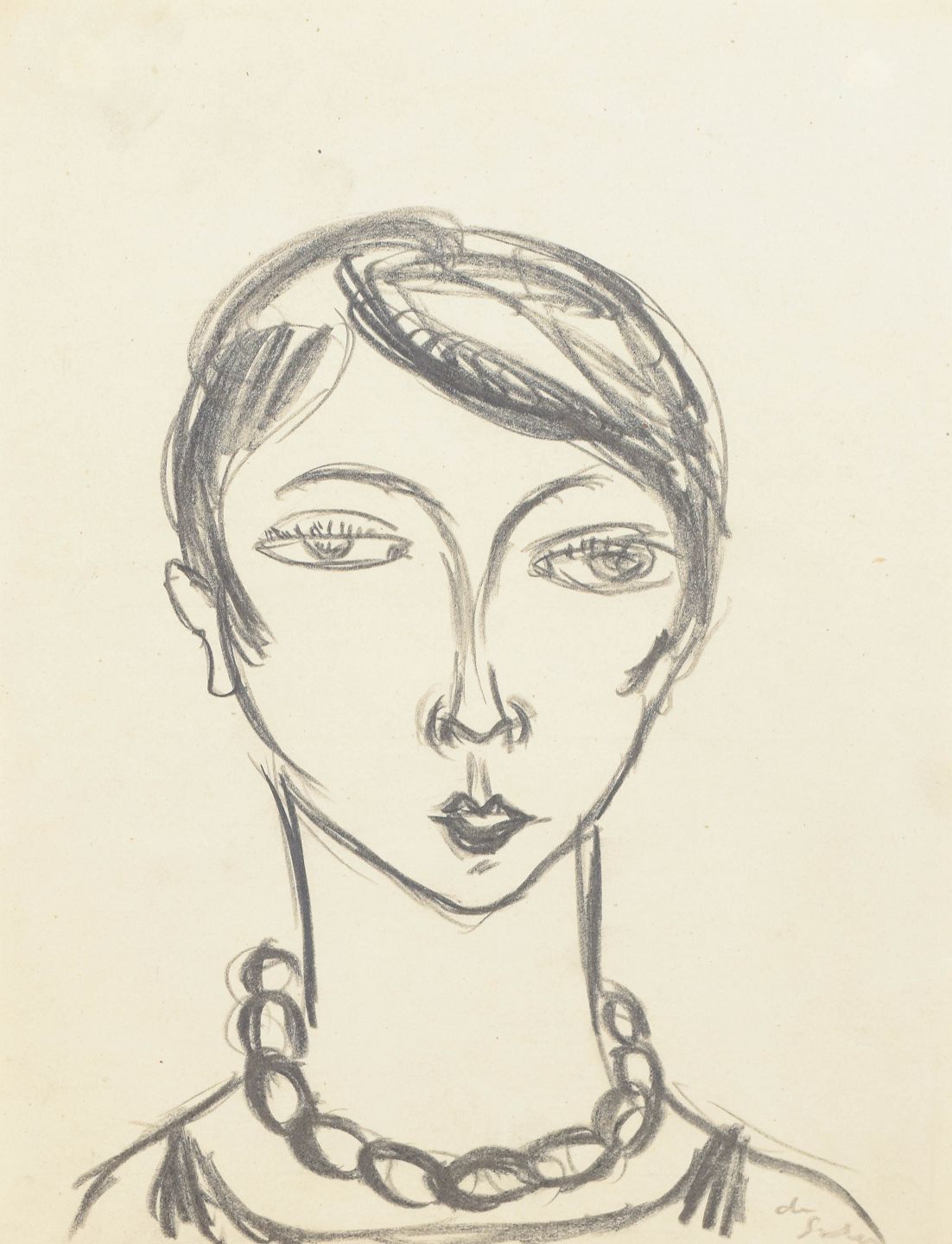 Art deco portrættegning udført på papir med elegant og økonomisk linjeføring. Motivet viser et stiliseret kvindeportræt med kort frisure og halskæde, gengivet i en enkel grafisk stil typisk for 1930’ernes modernistiske tegnekunst.
