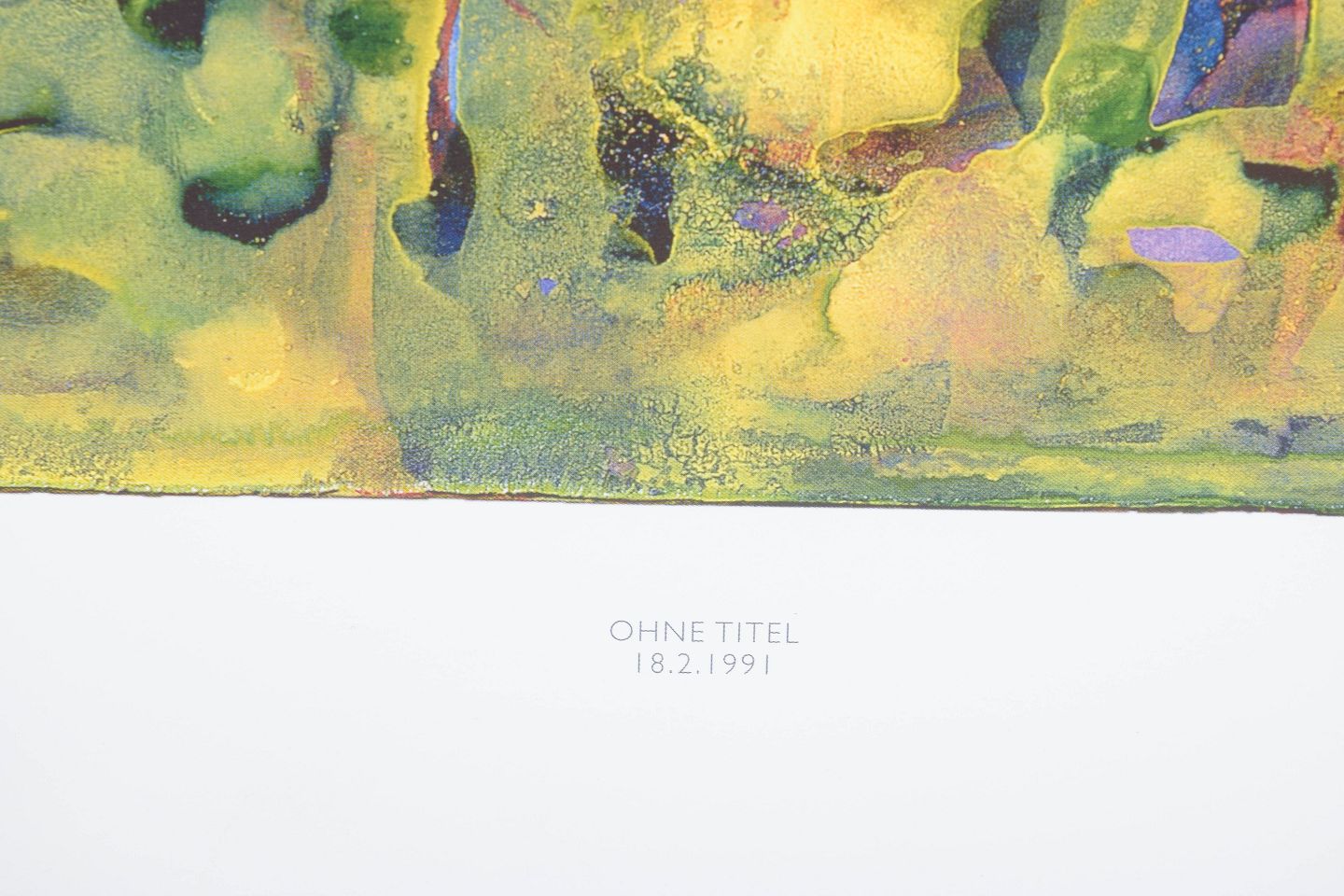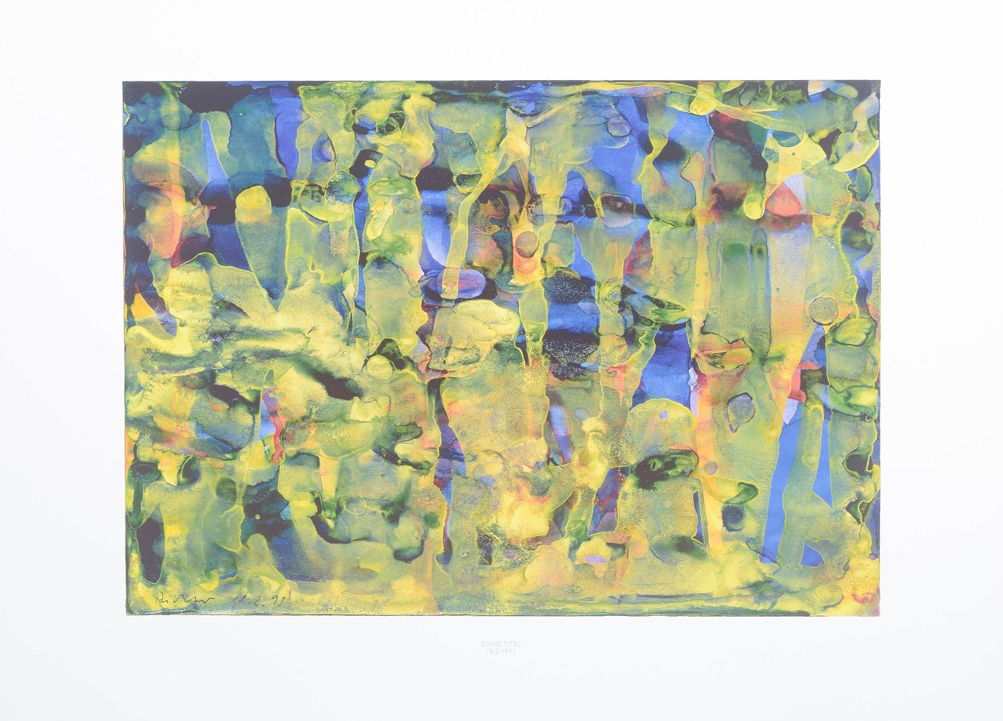 Abstrakt komposition udført som farvetryk med flydende, organiske former i lag af grønne, blå, gule og violette toner. Motivet har en karakteristisk opløst struktur med vertikale spor og transparente farvefelter. Signeret i trykket og dateret 1991.