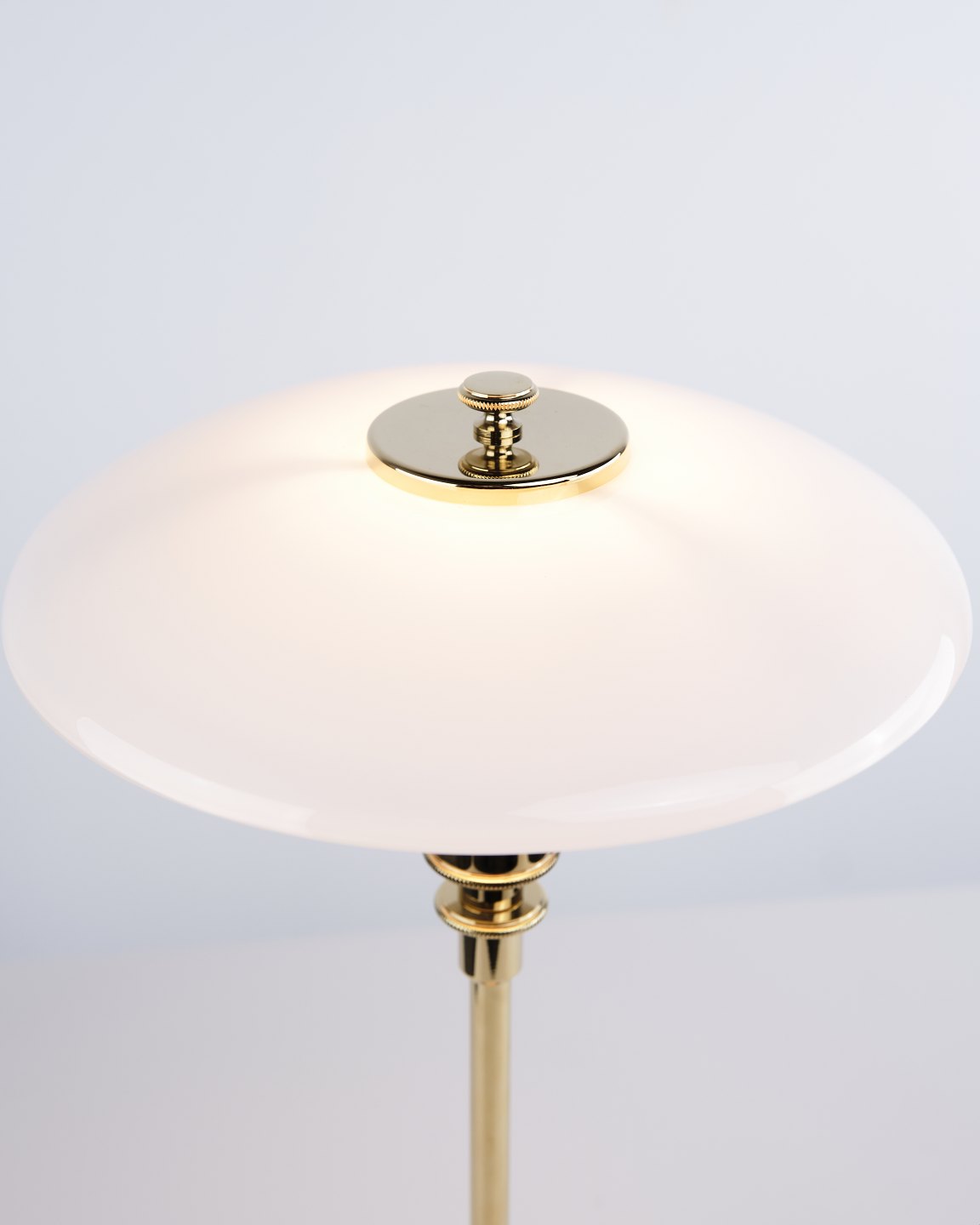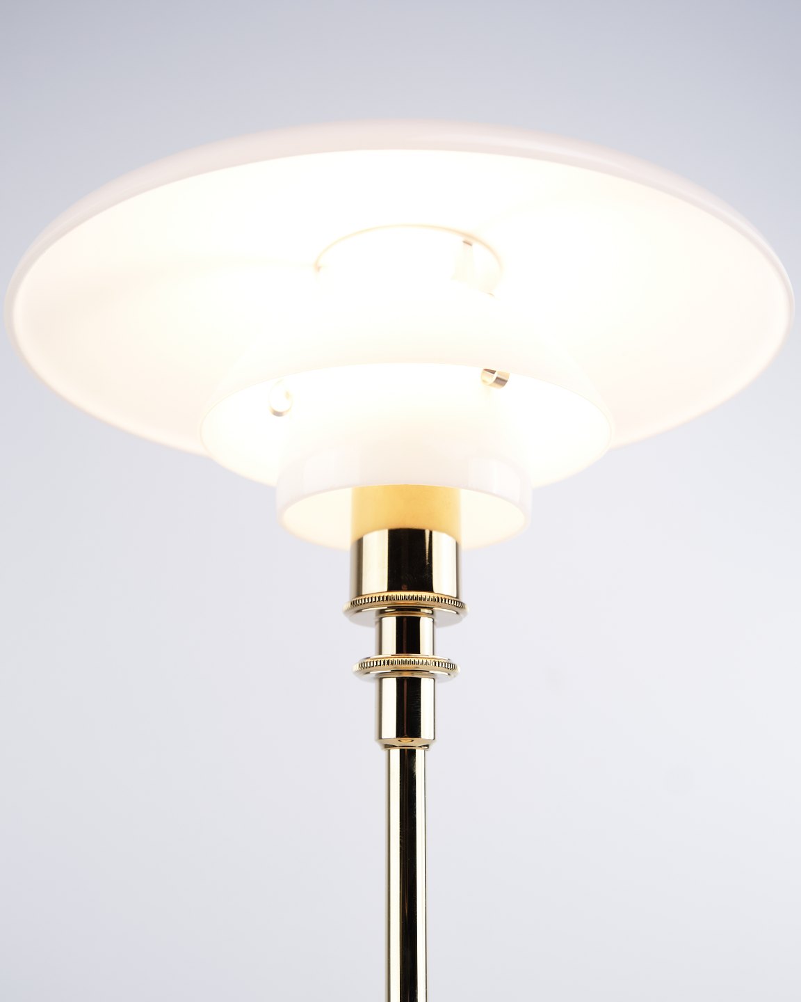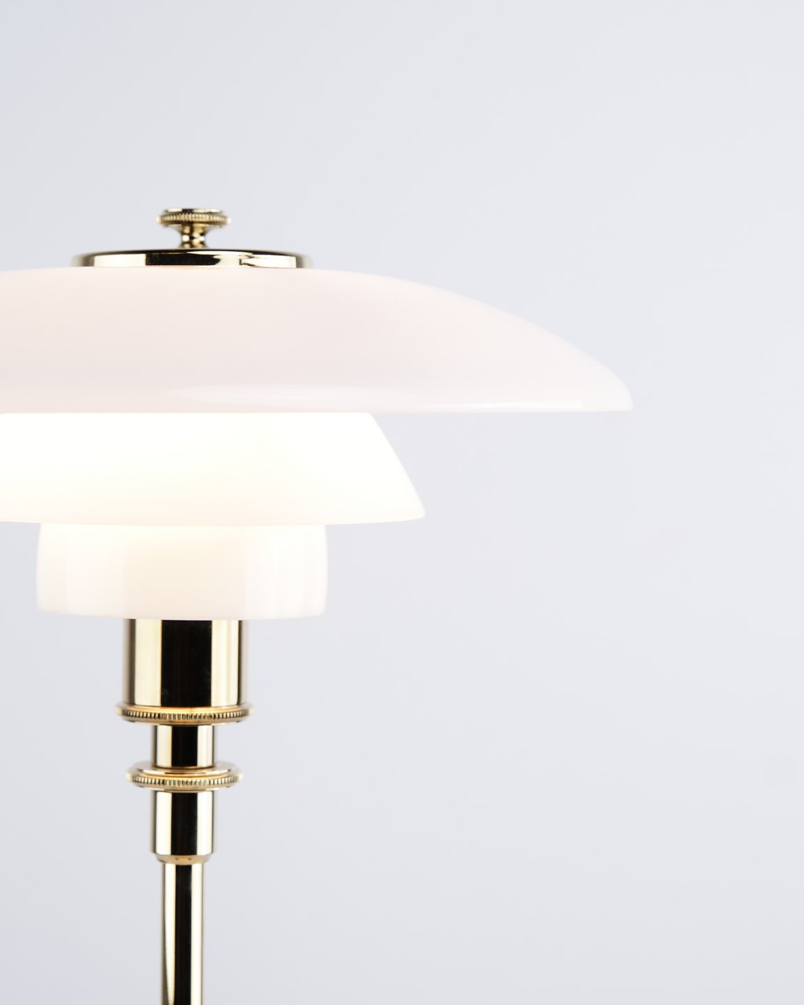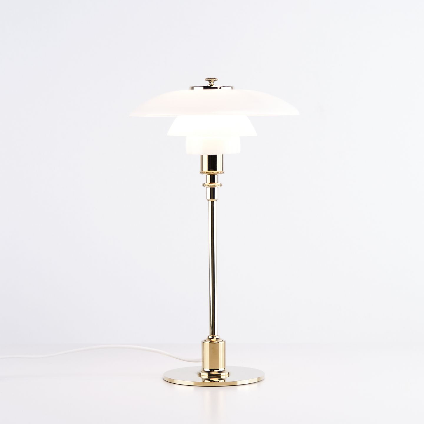 PH 2/1 bordlampe designet af Poul Henningsen og introduceret i denne version af Louis Poulsen i 2019. Lampen er udført med fod i messing og skærme i hvidt opalglas, som giver et blødt og behageligt lys. Det ikoniske treskærmssystem er udviklet til at sikre optimal lysfordeling og minimere blænding.