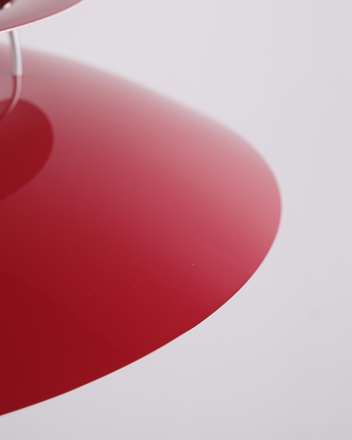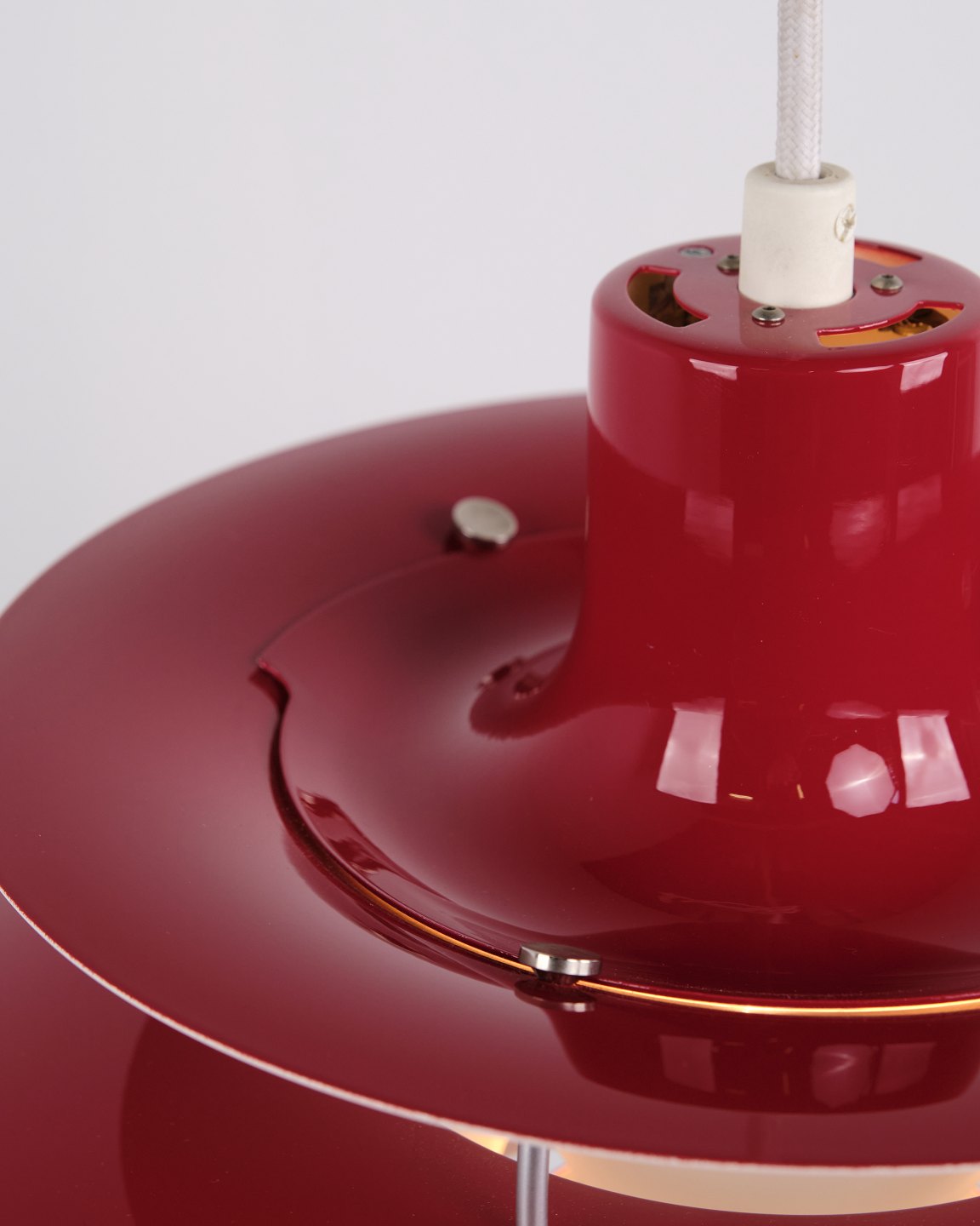 PH 5 pendel i rødlakeret metal fra Louis Poulsen designet af Poul Henningsen. Klassisk dansk lampe med blændfrit og funktionelt lys.