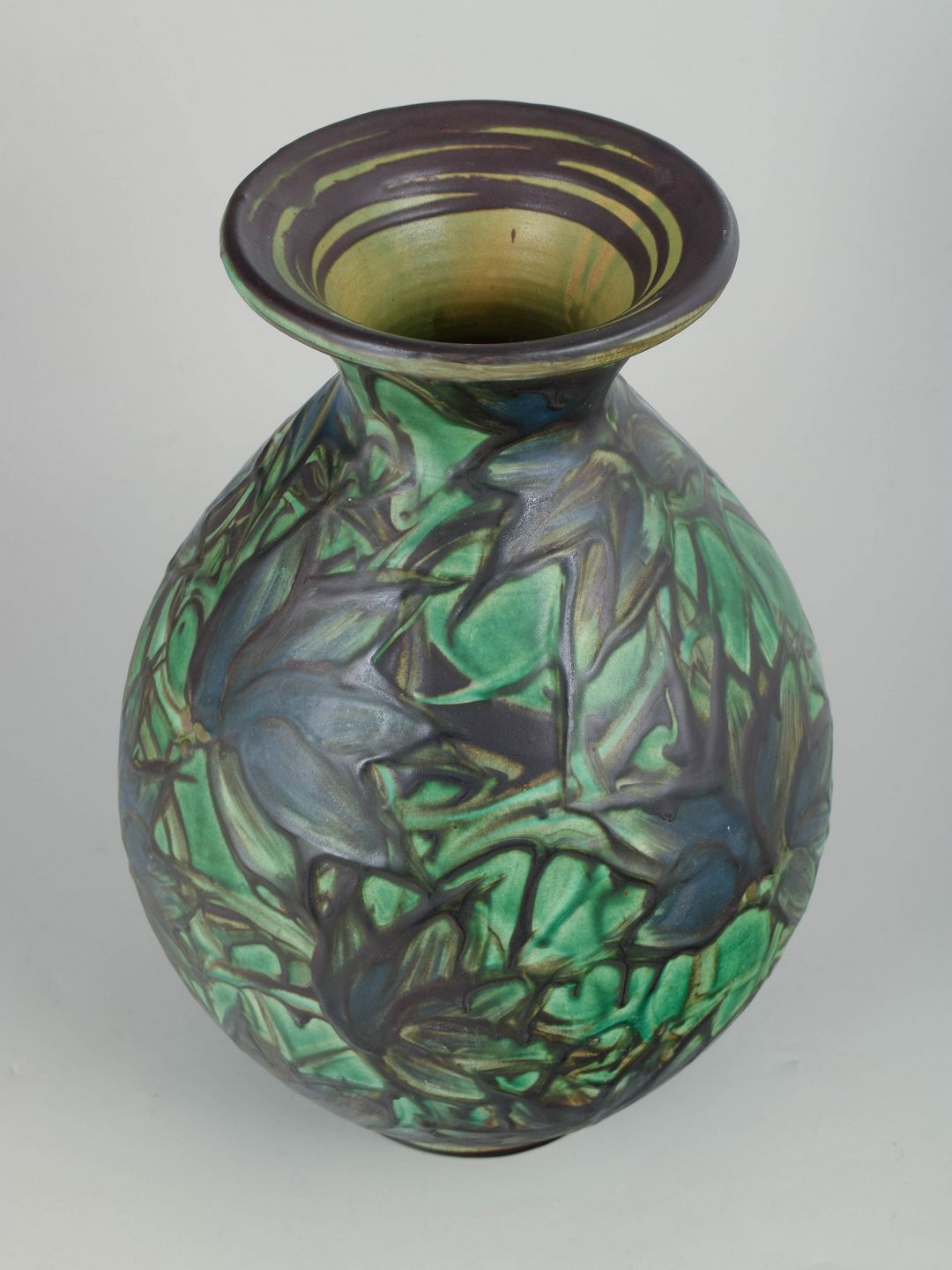 Stor vase i glaseret lertøj med balusterform og smal hals. Udført i den karakteristiske kohornsglasur med dybe grønne, blå og mørke nuancer, hvor glasuren flyder i organiske mønstre og skaber et dramatisk og levende overfladespil.