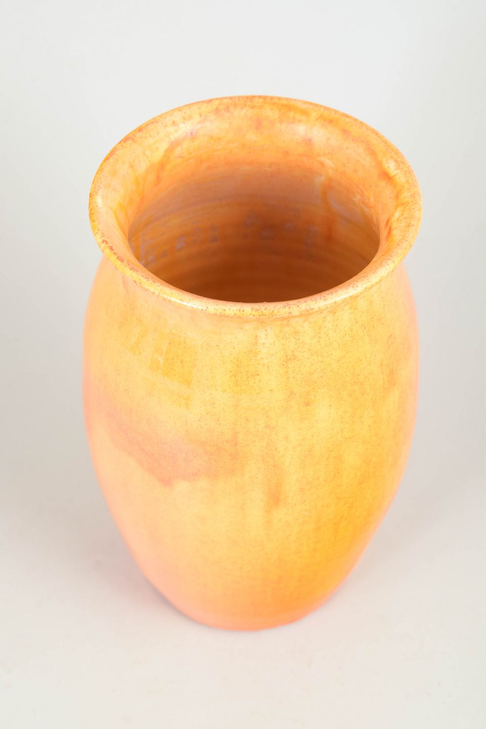 Elegant vase i glaseret lertøj med blød, let konisk form og svagt udadbøjet rand. Udført i lys gul glasur med varme orange nuancer og fine lodrette løb, der giver et levende og organisk udtryk. Signeret HAK i bunden.
