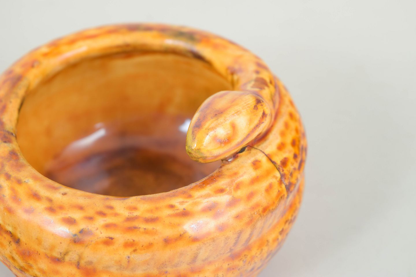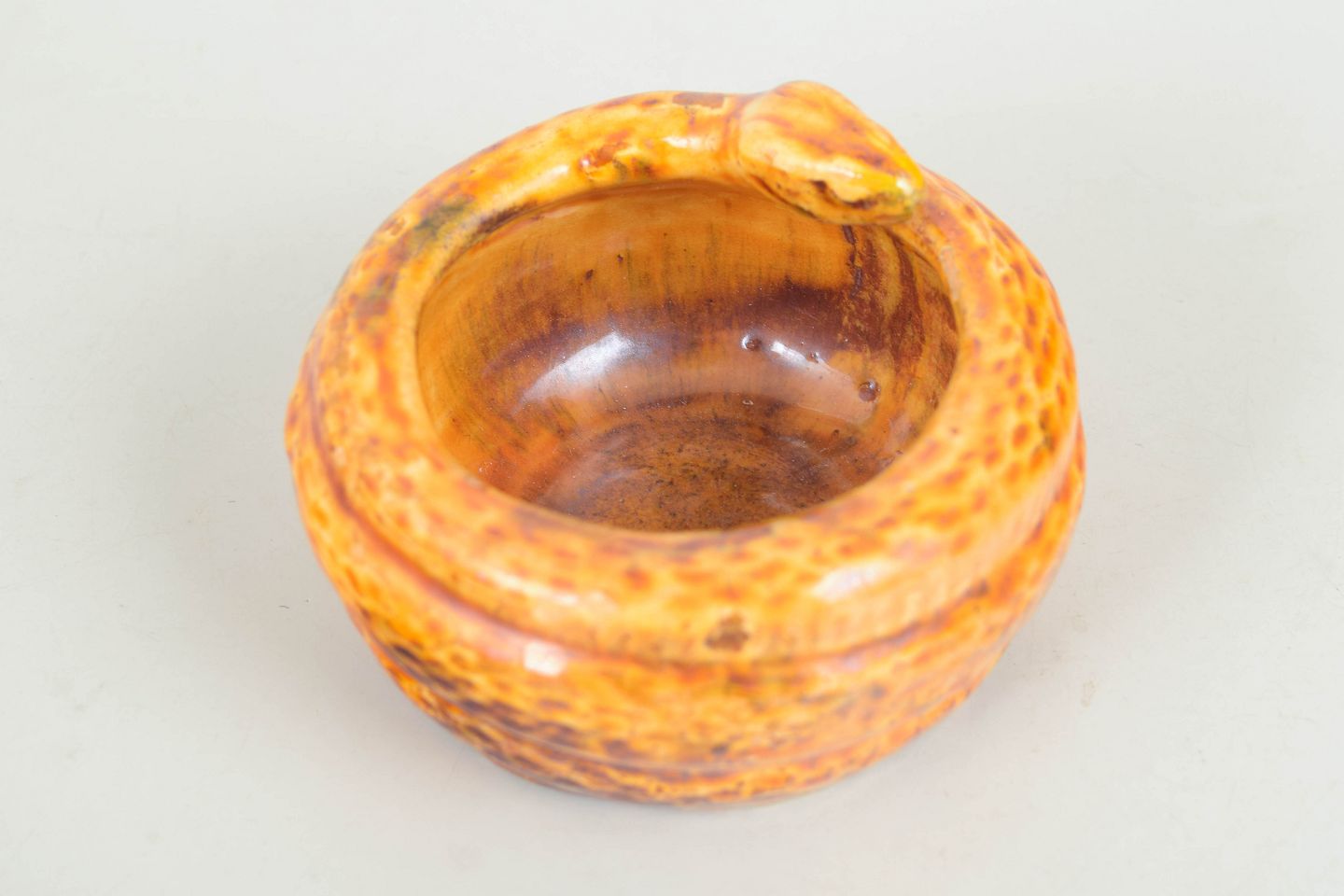 Dekorativ krukke i glaseret lertøj med modellering af slange langs randen. Udført i kraftig gul/orange krakeléglasur med levende spil i overfladen. Signeret HAK i bunden. Fremstår med produktionsfejl i form af revne ved randen, opstået under brænding.