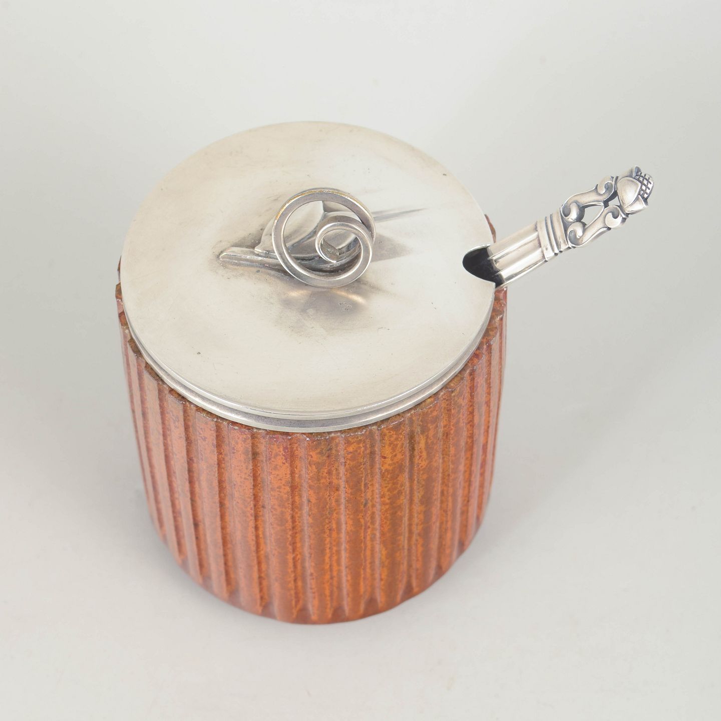 Hånddrejet cylindrisk stentøjskrukke med modelnummer 129, udført med lodret riflet korpus og varm rødbrun glasur med levende overfladespil. Monteret med låg samt ske fra Georg Jensen i Konge-mønster, udført i 1940’erne i et stilrent art deco udtryk.