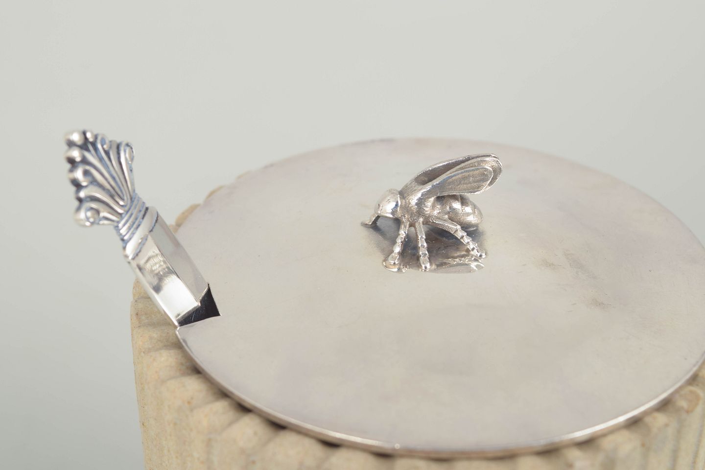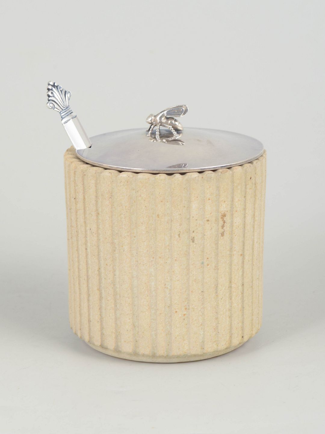 Hånddrejet cylindrisk stentøjskrukke med lodret riflet korpus og lys, mat glasur. Monteret med låg i sterlingsølv samt ske fra Georg Jensen, i det klassiske dronninge-mønster, udført i 1940’erne.