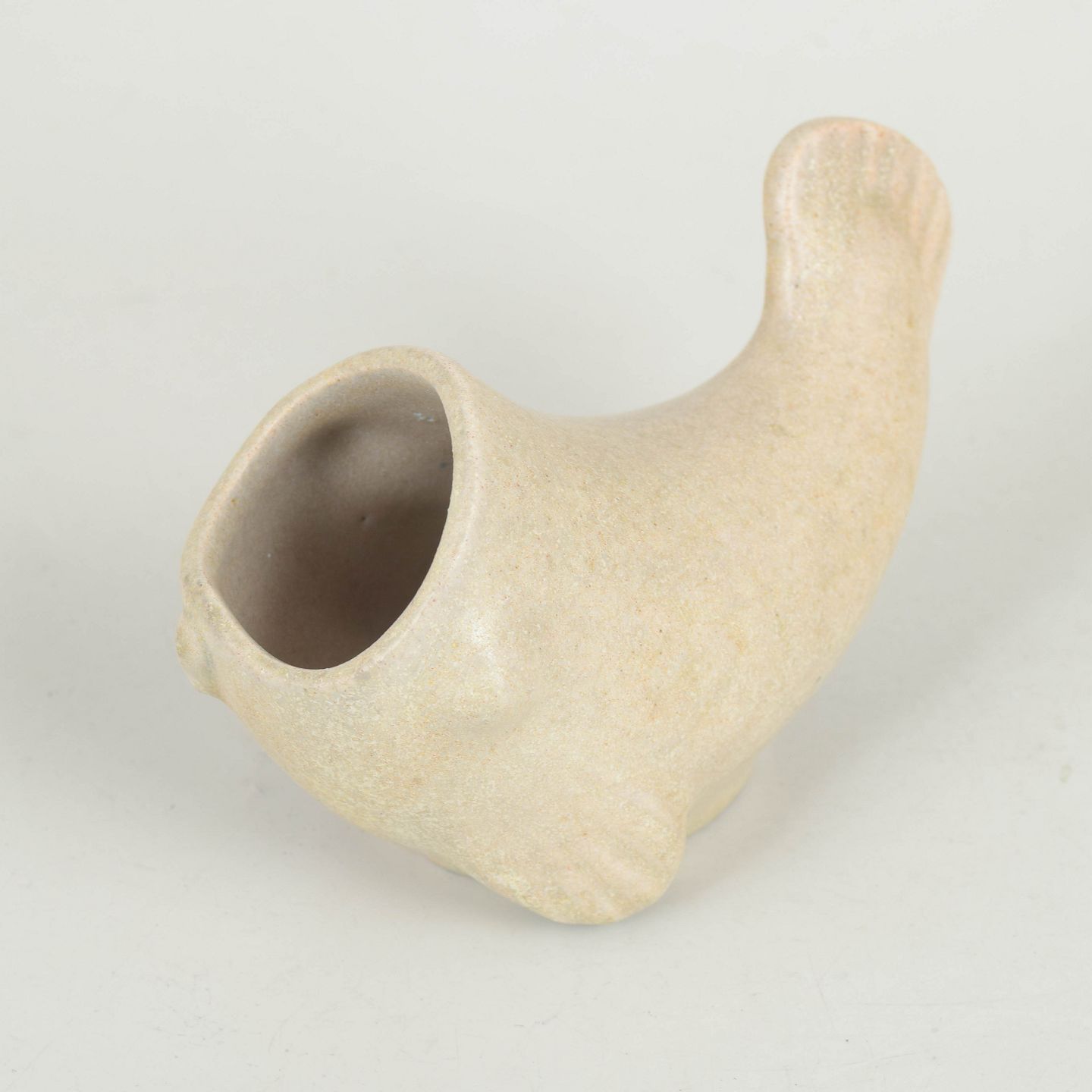 Organisk formet fisk i hånddrejet stentøj med blød, afrundet form og lys, mat glasur med diskret spil i overfladen. Et karakteristisk eksempel på Arne Bangs naturalistiske og skulpturelle formsprog fra 1940’erne.
