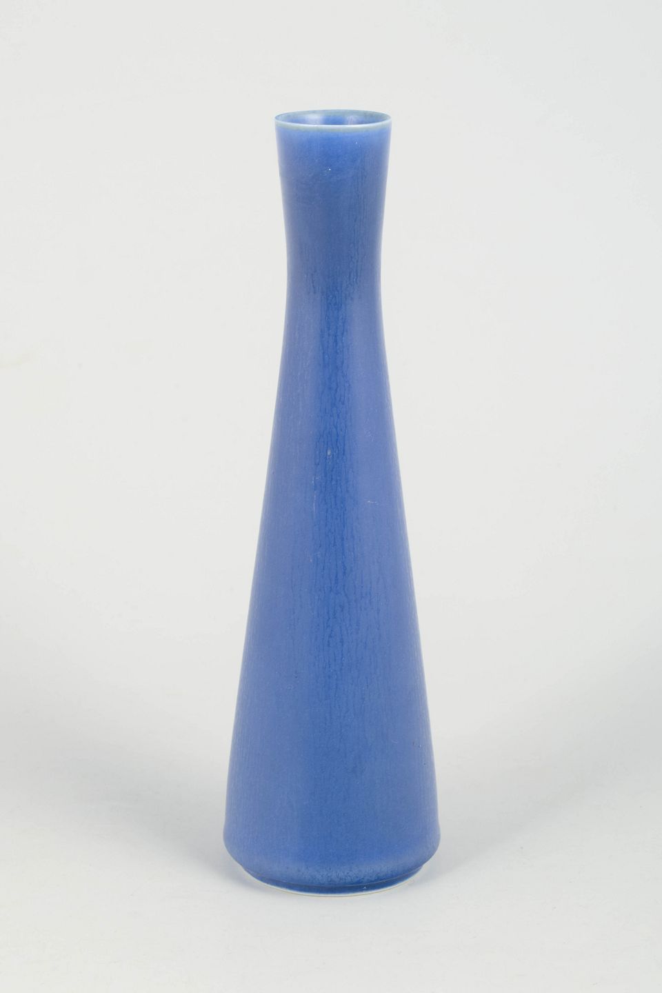 Slank og elegant formet vase i drejet stentøj med karakteristisk blå harepelsglasur, signeret FB under bunden.
