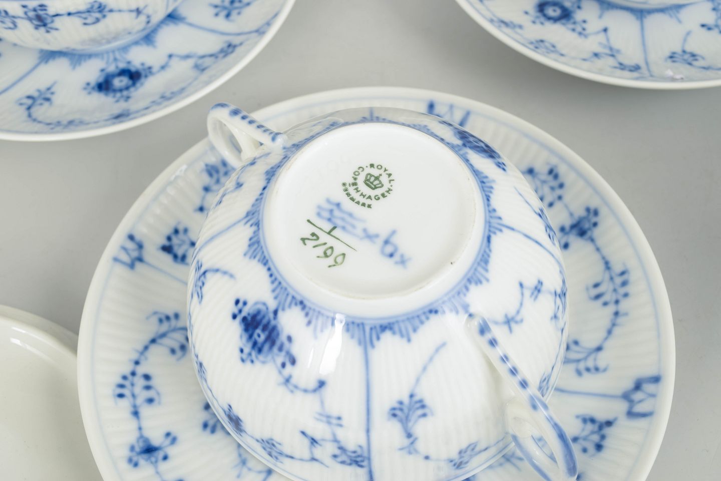 Royal Copenhagen, musselmalet riflet sæt af fire bouillonkopper med underkopper.