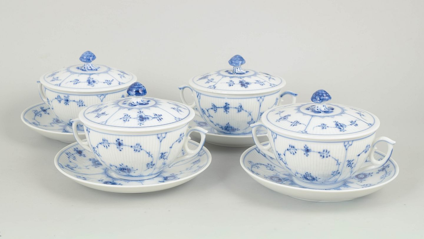 Royal Copenhagen, musselmalet riflet sæt af fire bouillonkopper med underkopper.