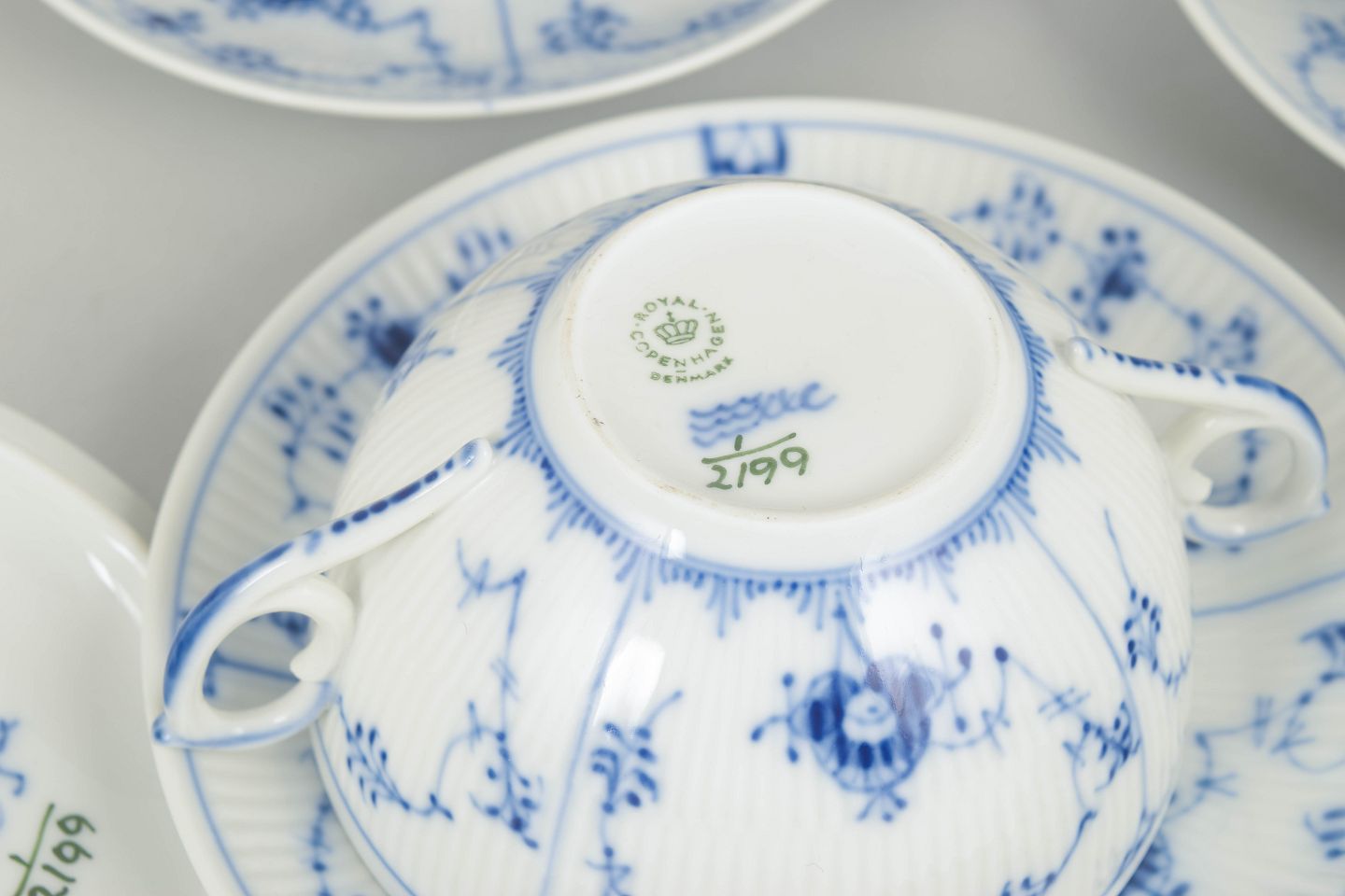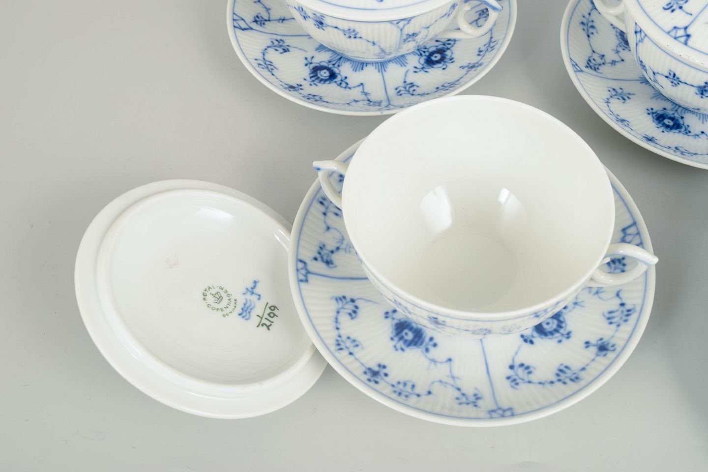 Sæt af fire bouillonkopper i porcelæn med matchende underkopper, dekoreret i underglasur blå med klassisk musselmalet riflet mønster. Model 1/2199, 1. sortering, dateret 1966.