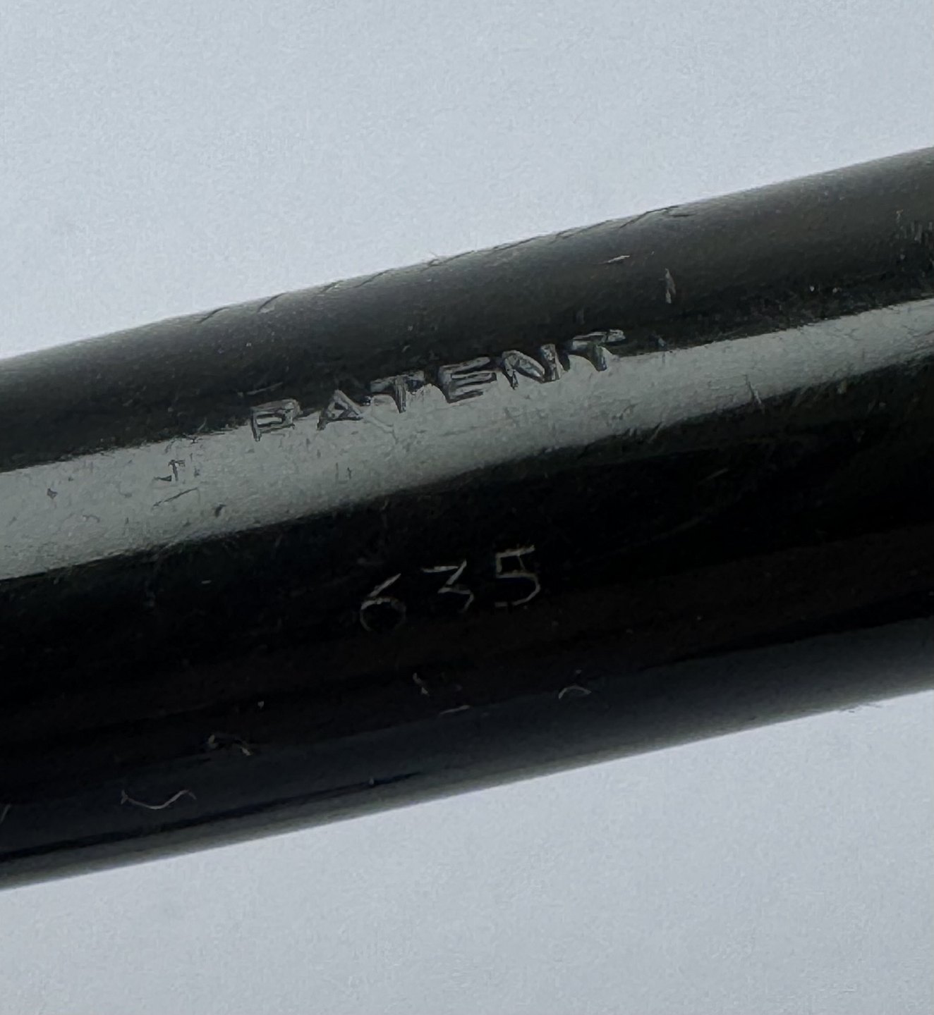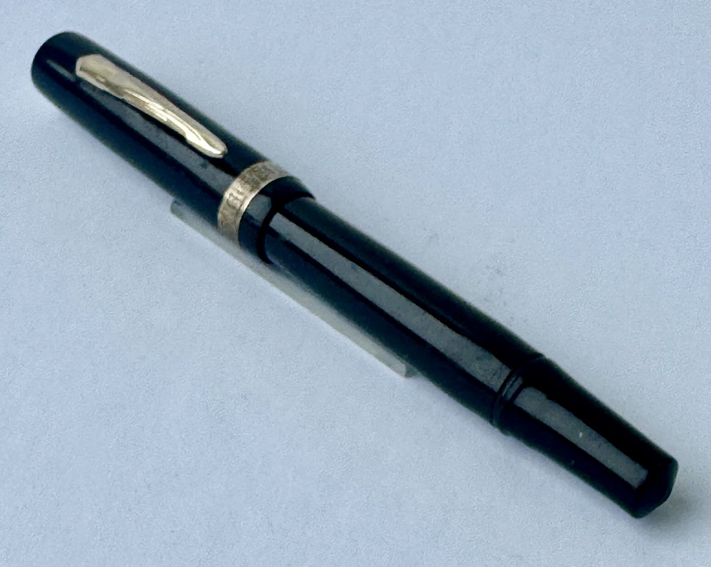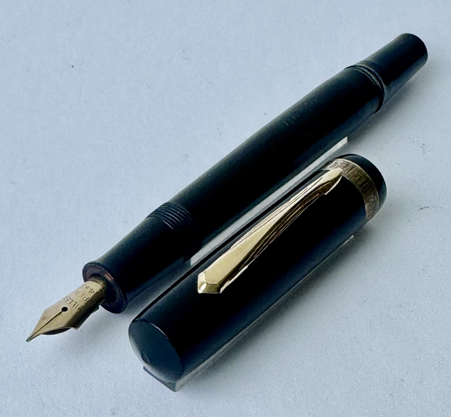 Der skal indsættes en ny gummisæk før end pennen igen kan optage blæk og skrive. Bortset fra et lille skår på hætten (se foto) er pennen i god stand. Alle dele originale til denne model. Længde 12,6 cm