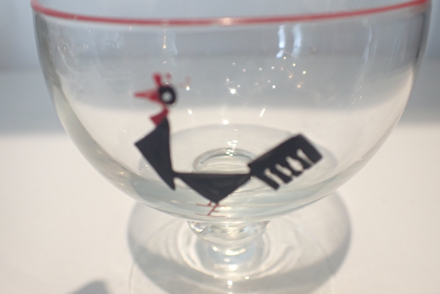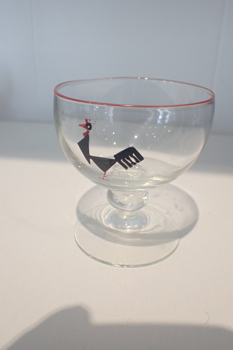 4 emaljemalede glas med rød kant og stiliseret sort hane. Holmegård. Højde: 7,5 cm. Halvkugleformet kumme på lille stilk med rund knap.