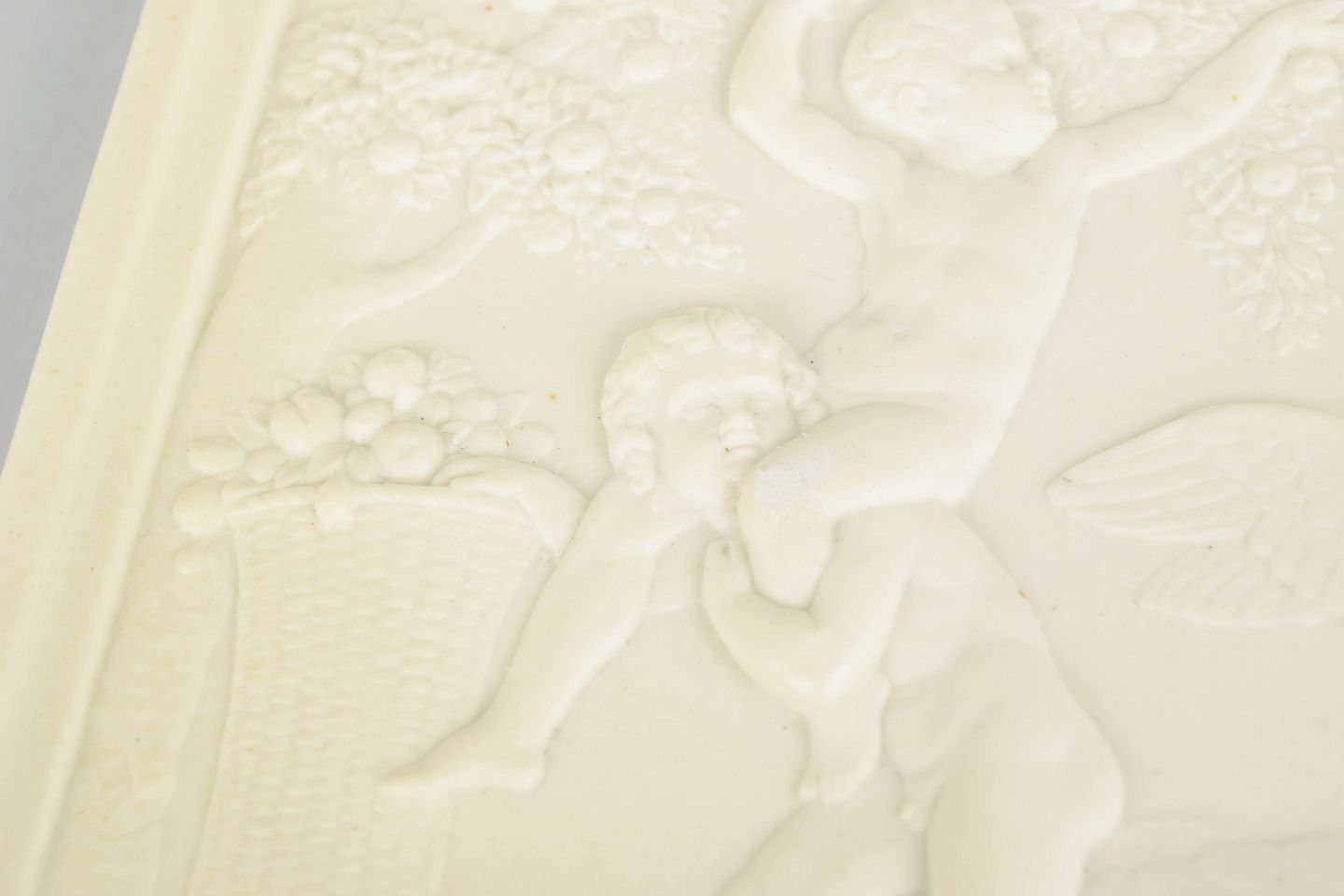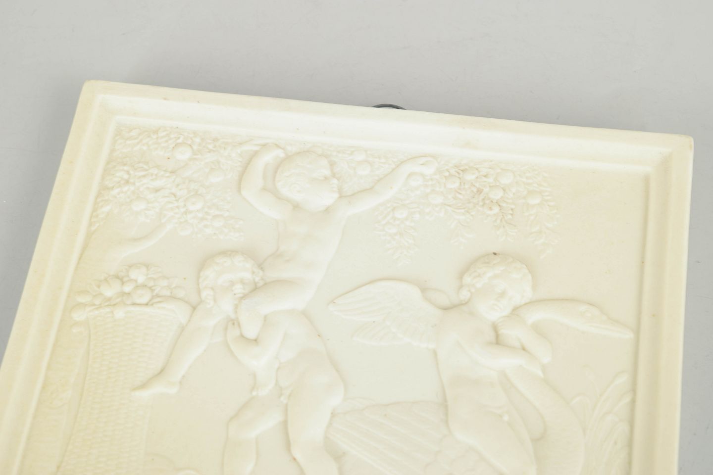 Rektangulært vægrelief i hvidt bisquitporcelæn med klassicistisk motiv af putti efter Bertel Thorvaldsen, udført med fine detaljer og blød modellering i nyklassicistisk stil.