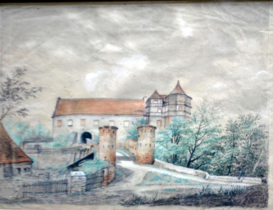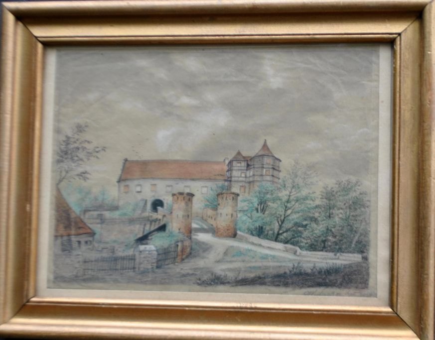 Ubekendt kunstner (19. årh.):En borg. Akvarel. Signeret 1844. 20,5 x 27 cm.