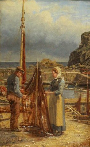 Fisker og fiskerkone ordner garn på havnen - Bornholm 1906