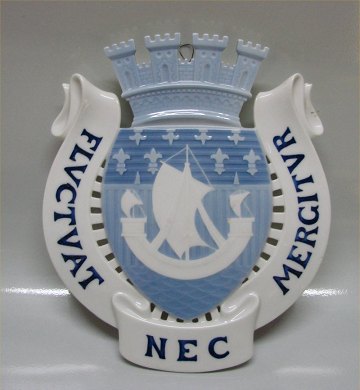 Bing & Grøndahl Byvåbenplatte B&G mindeplatte nr 12 1899 Paris' byvåben Fluctuat NEC Mergitur 25 cm Minimalt kanthak se billede. Blev brugt ved verdensudstillingen i Paris som pynt på standen
