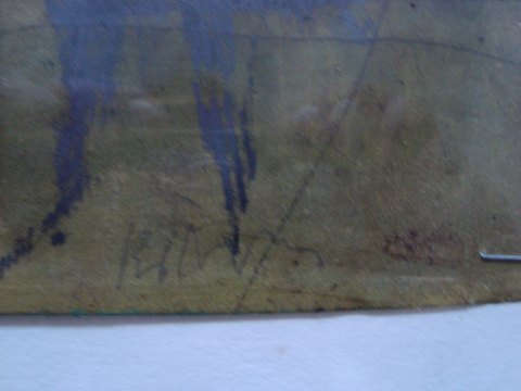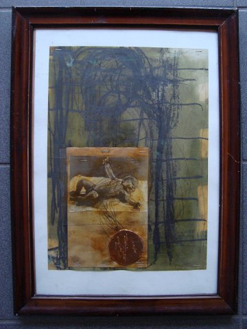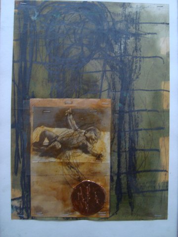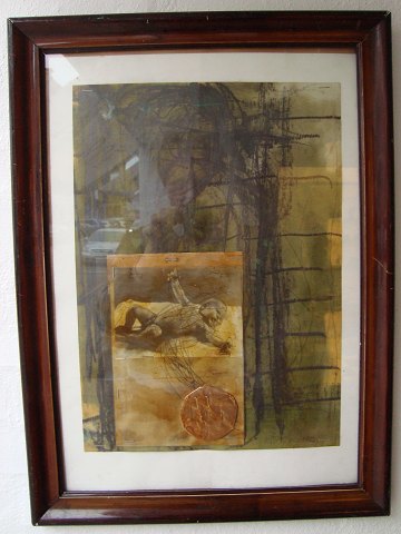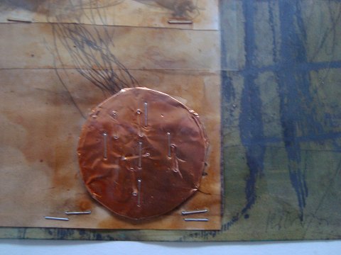 Mixed Media bag glas - bl.a. oliekridt, gouache, kobber, kontorclips og foto.
