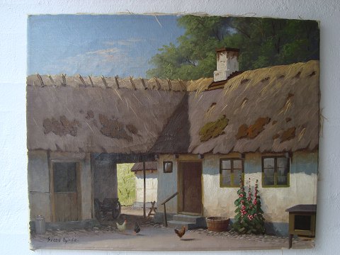 Maleri - Frederik Drews - Bondegårdseksteriør med høns!