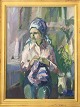 Maleri af Arnold W. Pedersen - Siddende kvinde der ammer sit barn.