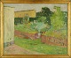 Maleri af Peder Brøndum Sørensen - Landskab med huse og graner 1967.