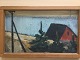 Maleri af Peder Brøndum Sørensen - Rødt hus og graner ved Havet 1969.