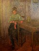 Fritz von Uhde (1848-1911) stil ca. 1900: Interiør med en strikkende pige. ...