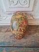 Gammel svensk jule-lågkrukke i porcelæn med nisse på toppen.
