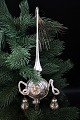 Gammelt glasspir til toppen af juletræet i sølv og små klokker.