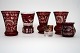Vase af rødt opaline glas med gulddekoration og grønne sten.
