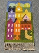 Svensk kelim vægtæppe af tekstilkunstner Ingegerd Silow. Bymotiv med skov i ...