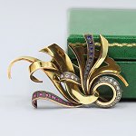 Surel; Brooch in 14k gold set with diamonds, sapphires and rubies