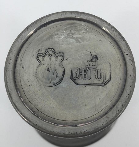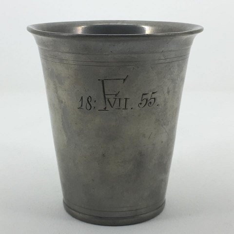 Dansk drikkebæger af tin fra Søetatens Hospital, København. Med monogram af Frederik VII, 1855. H: 11,5 cm, diameter: 10,5 cm