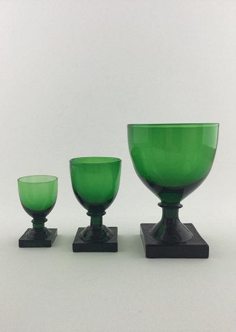 Holmegaard; Gorm den gamle. Grønt glas. Ca. år 1920. H. 7 cm (350 kr.), 9 cm (500 kr.) samt 13 cm (850 kr.). Kontakt os gerne for aktuel lagerbeholdning.