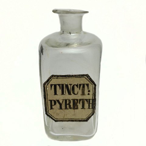 Apotekerflaske af glas med bemalet etikette med teksten: "TINCT: PYRETH". H. 12,5 cm.