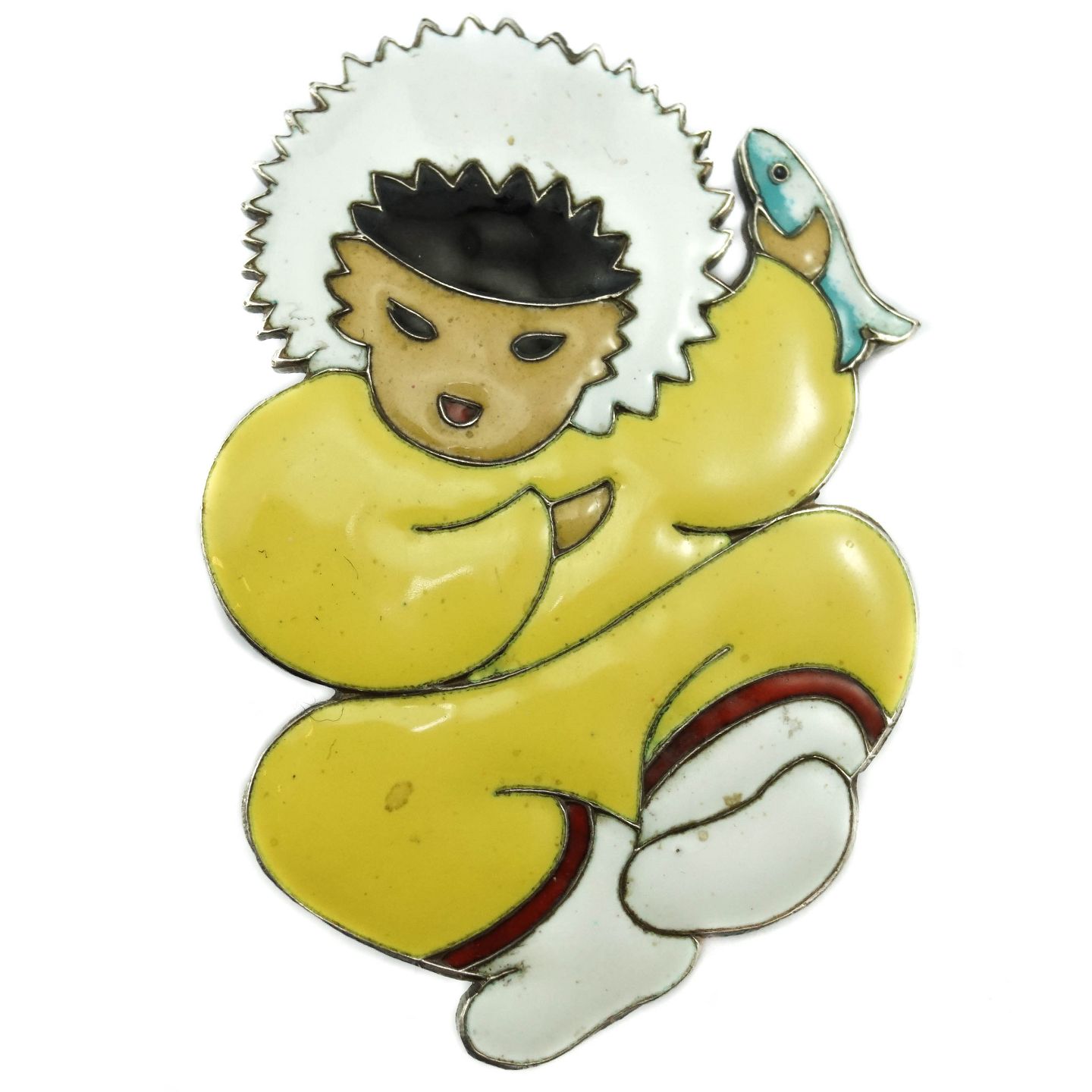 A. Dragsted; En broche i form af eskimo, lavet i sterling sølv og prydet med emalje.