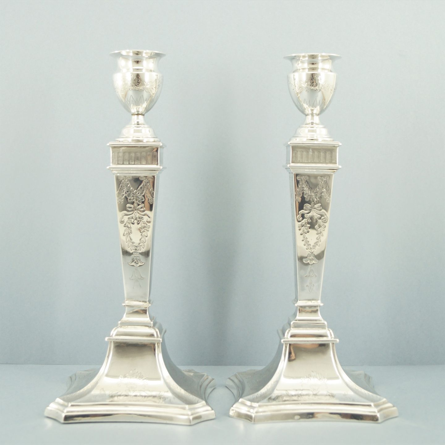 Par høje lysestager af sterling sølv, Louis XVI-stil