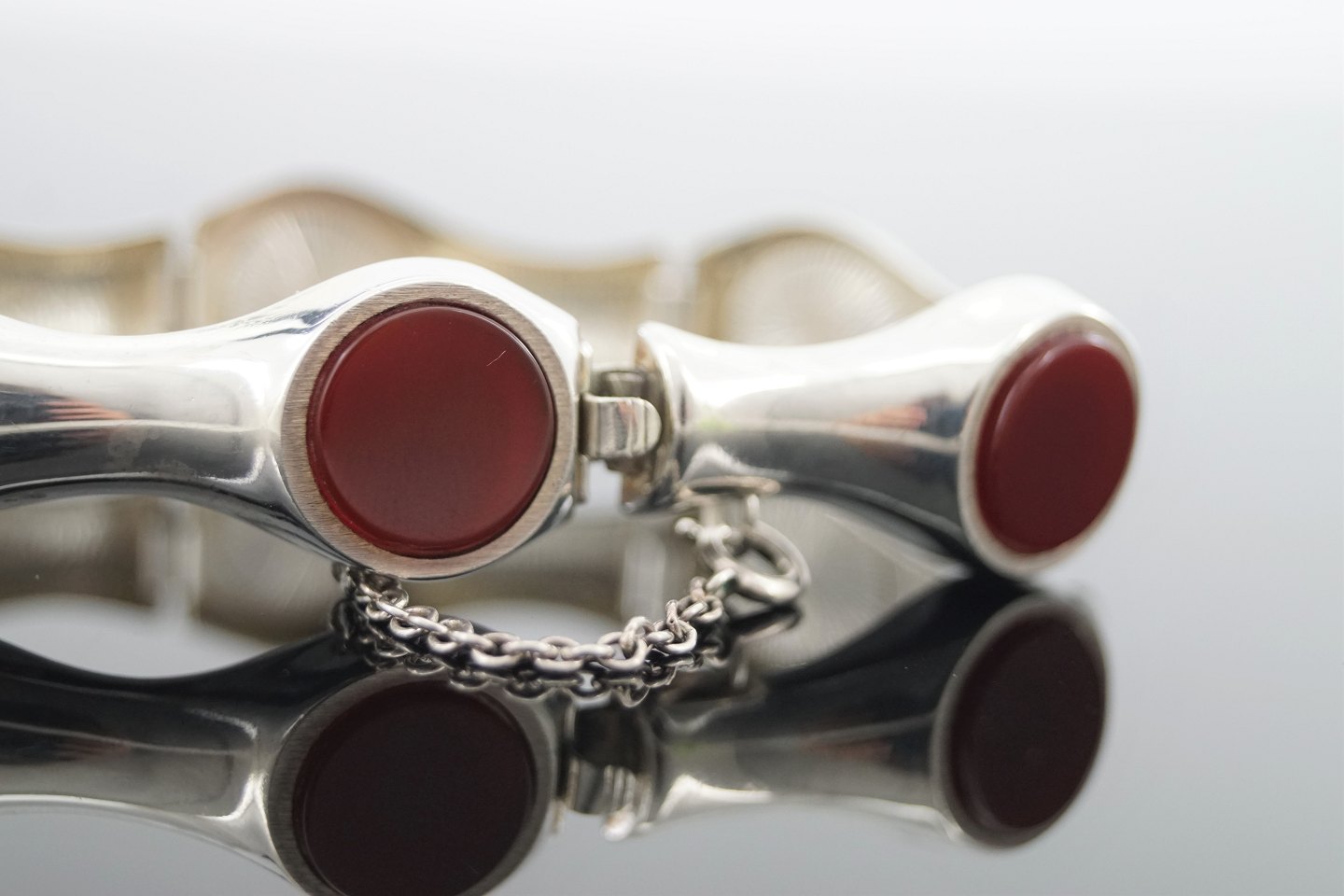 Børge Alexis Godtbergsen; Armbånd af sterling sølv prydet med carneoler. Design med runde stene, lukkes med kasselås og sikkerhedskæde.