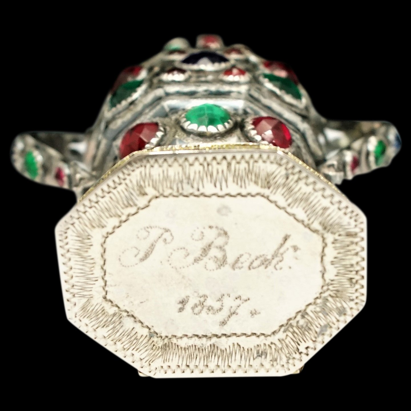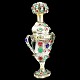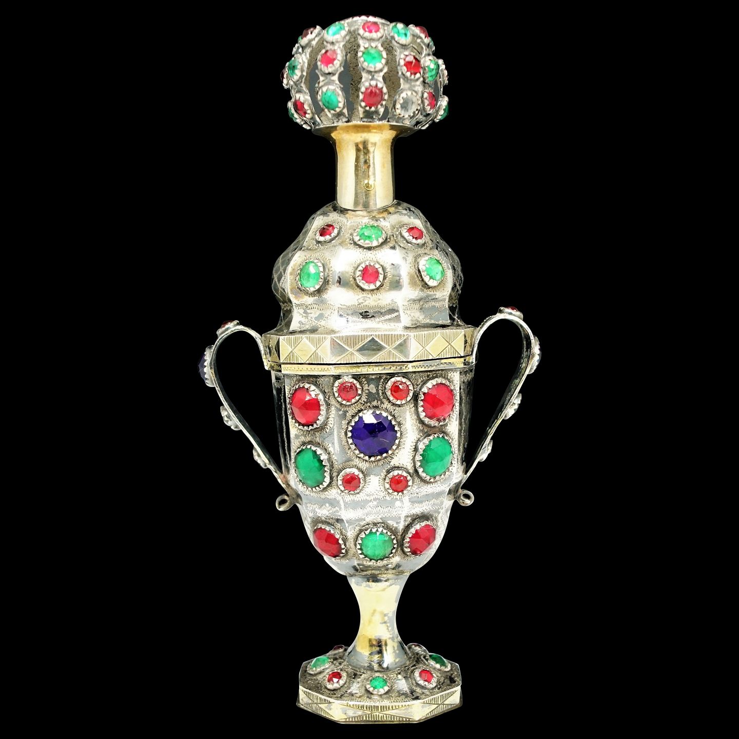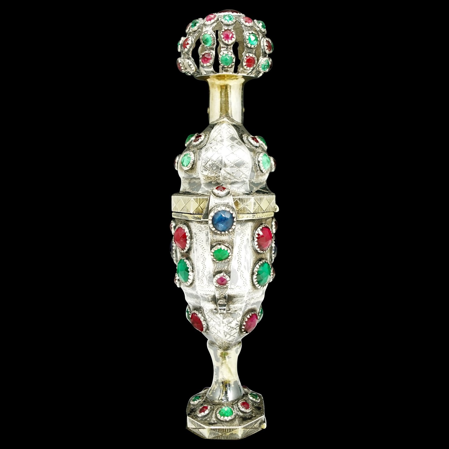 Peter Christian Johansen; Sønderjysk hovedvandsæg af delvist forgyldt sølv, indvendigt forgyldt, prydet med 89 røde, blå og grønne flusser, top med gennembrudt krone, sekskantet fodstykke med balsamgemme. Punslet 1857.