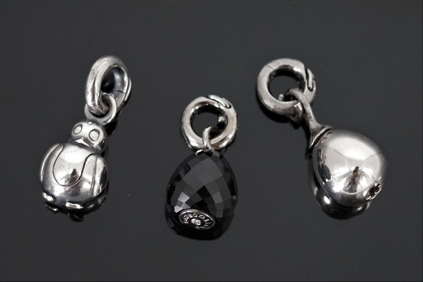 Charlotte Lynggaard for Ole Lynggaard; Charms til at sætte på armbånd eller halskæder. Kan åbnes i øsknet, så de også kan sættes på en perle- eller stenkæde.