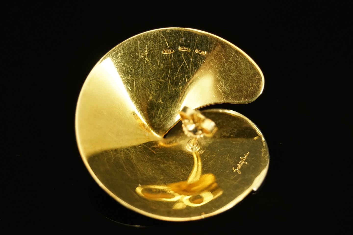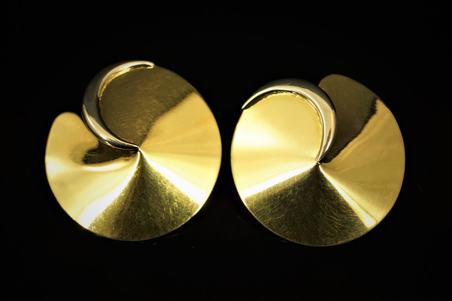 Ørestikker af 18 kt. guld, prydet med hvidguld. Diameter 3,4 cm.