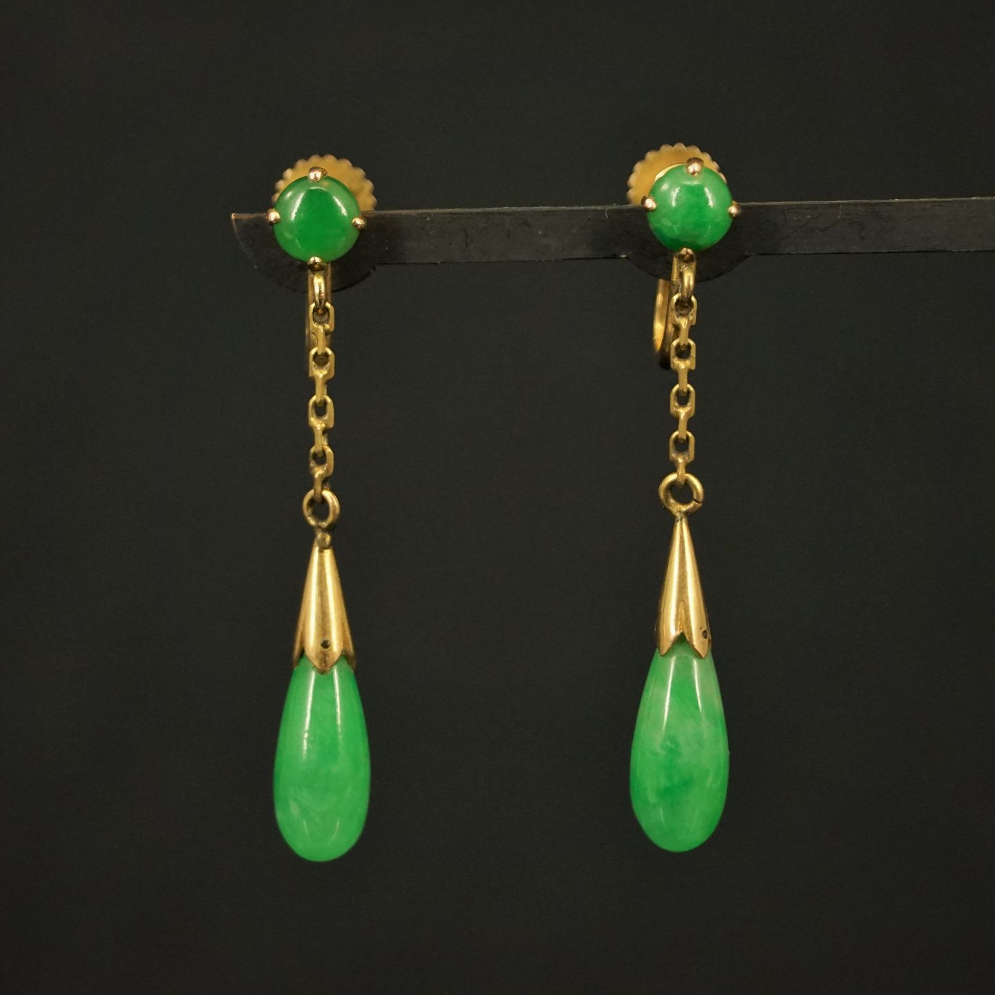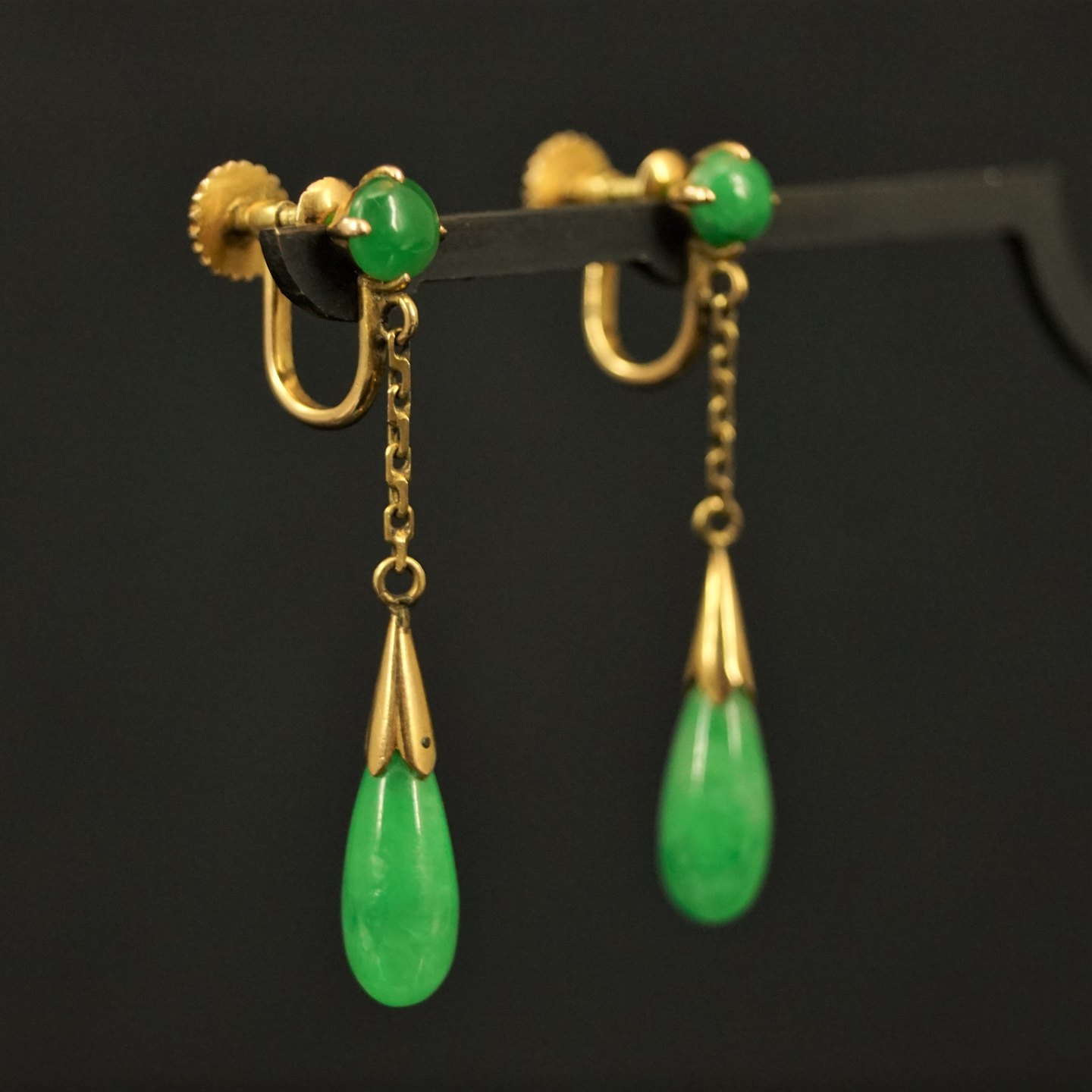 Par øreskruer af 14 kt. guld, prydet med jade. Omkring år 1920. Ørehænger l. 3,7 cm.