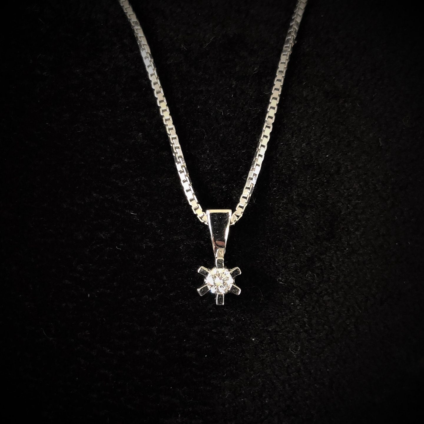 A 14k white gold necklace set with a diamond pendant