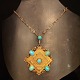 P. Hertz; Halskæde med stort kvadratisk vedhæng af 14 kt. guld, prydet med turkiser og en diamant.