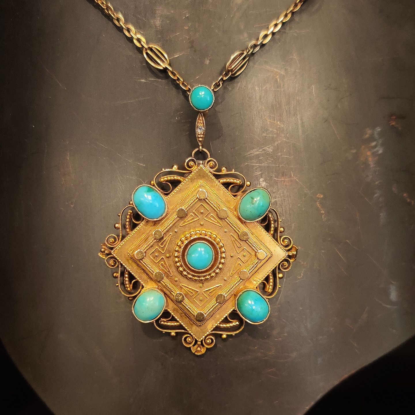 P. Hertz; 1800-tals halskæde med smykke af 14 kt. guld med turkiser og en diamant