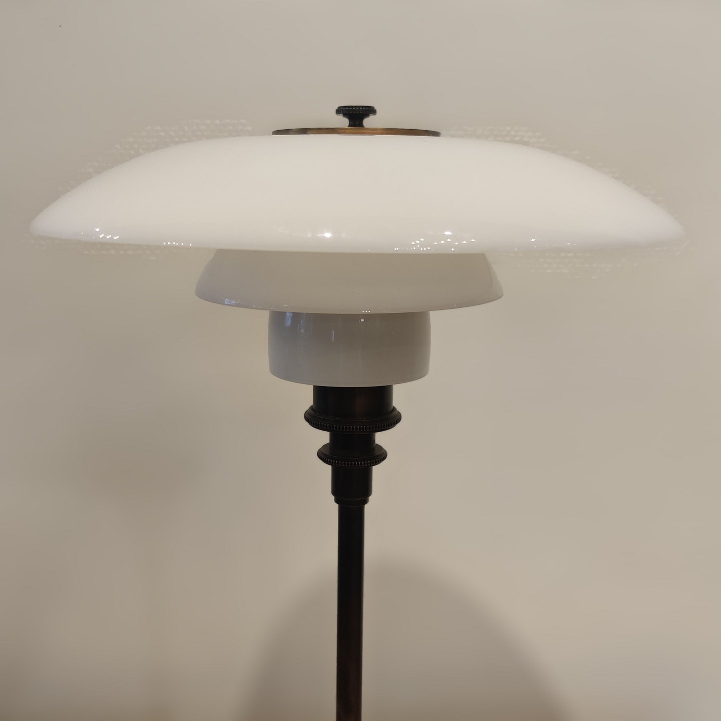 Poul Henningsen; Jubilæums PH-3/2 bordlampe fra 1994 af bruneret messing med skærme af opalglas