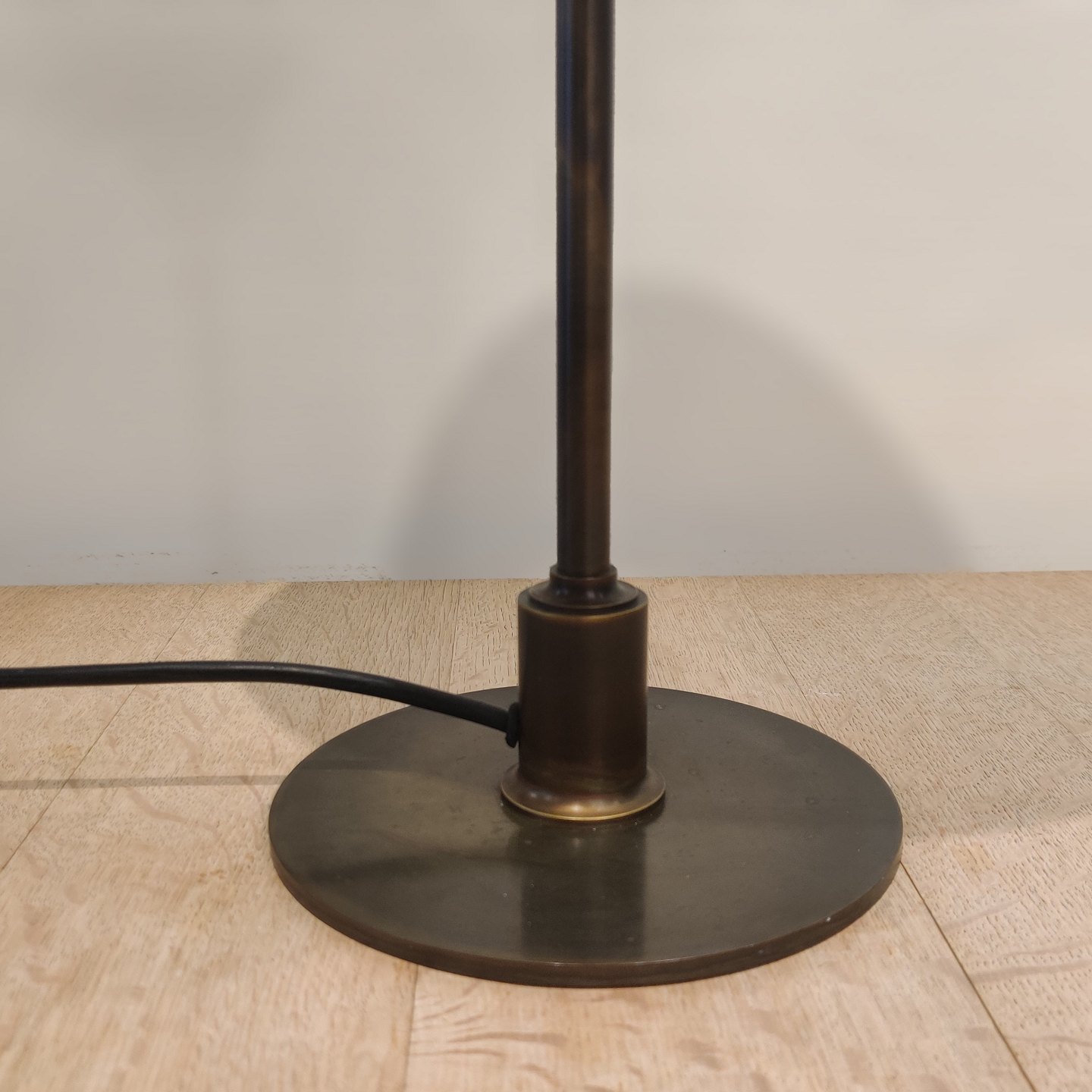 Poul Henningsen; PH-2/3 bordlampe. Lampe med bruneret messingstamme samt fodstykke af bruneret messing, monteret med skærme af opalglas.