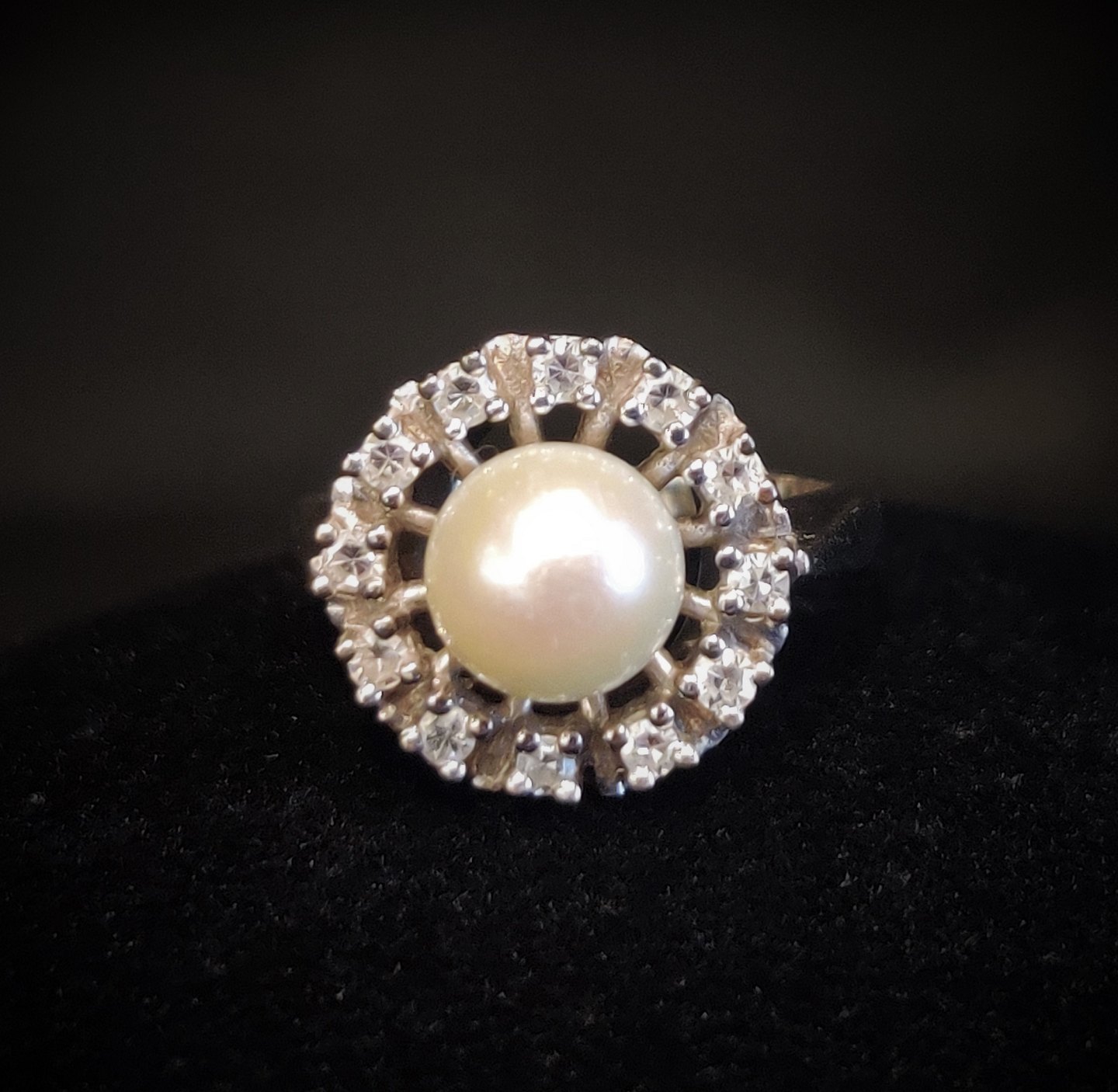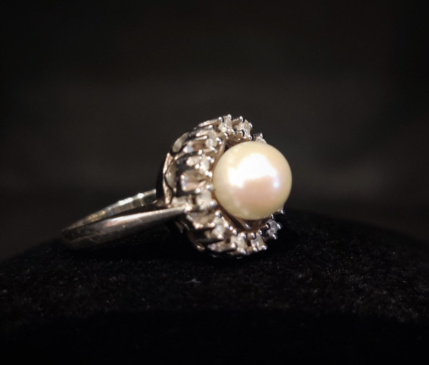 Flemming Lund; Ring af 14 kt. hvidguld, prydet med perle og diamanter