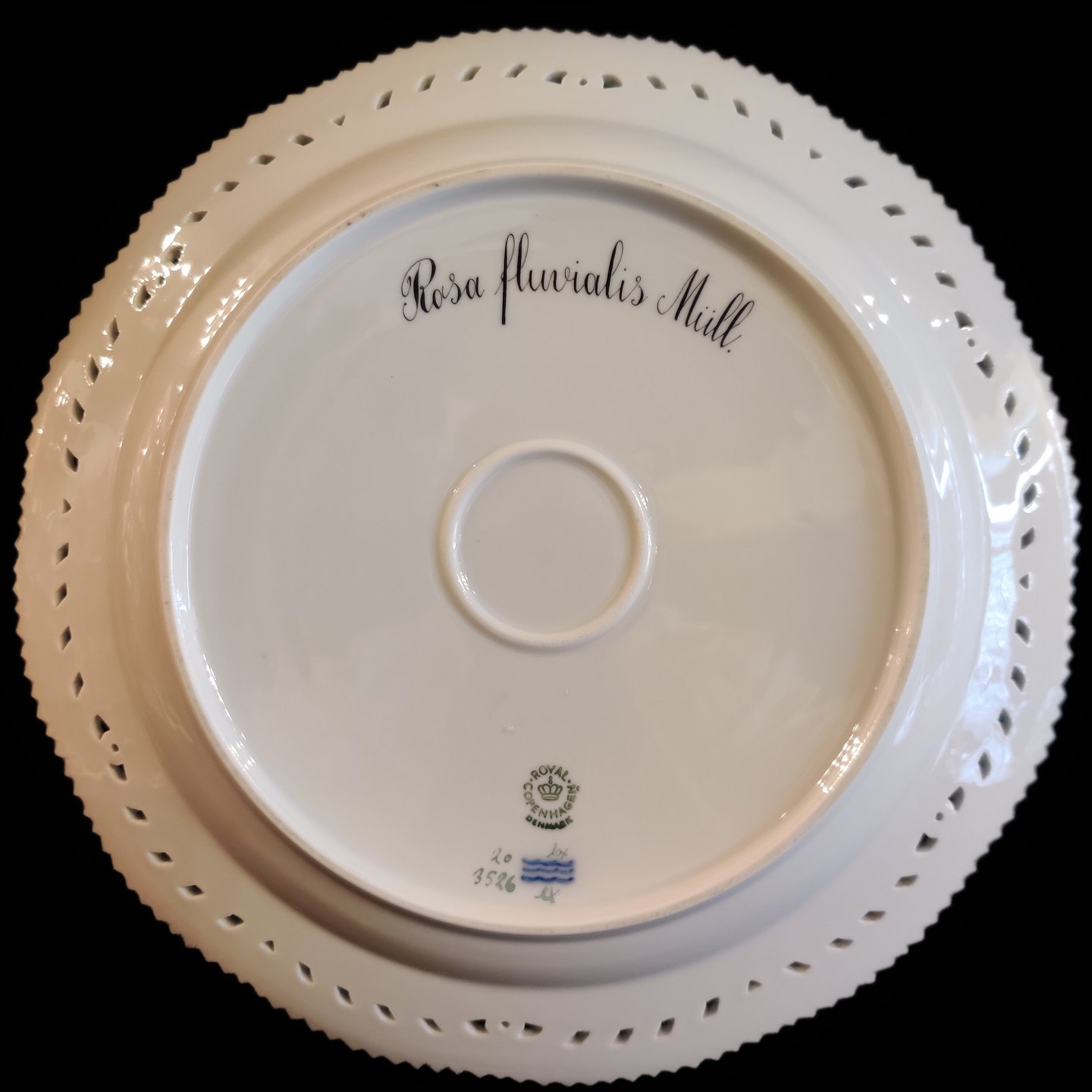 Royal Copenhagen, Flora Danica porcelæn; Fad/tallerken #3526 med gennembrudt kant.
